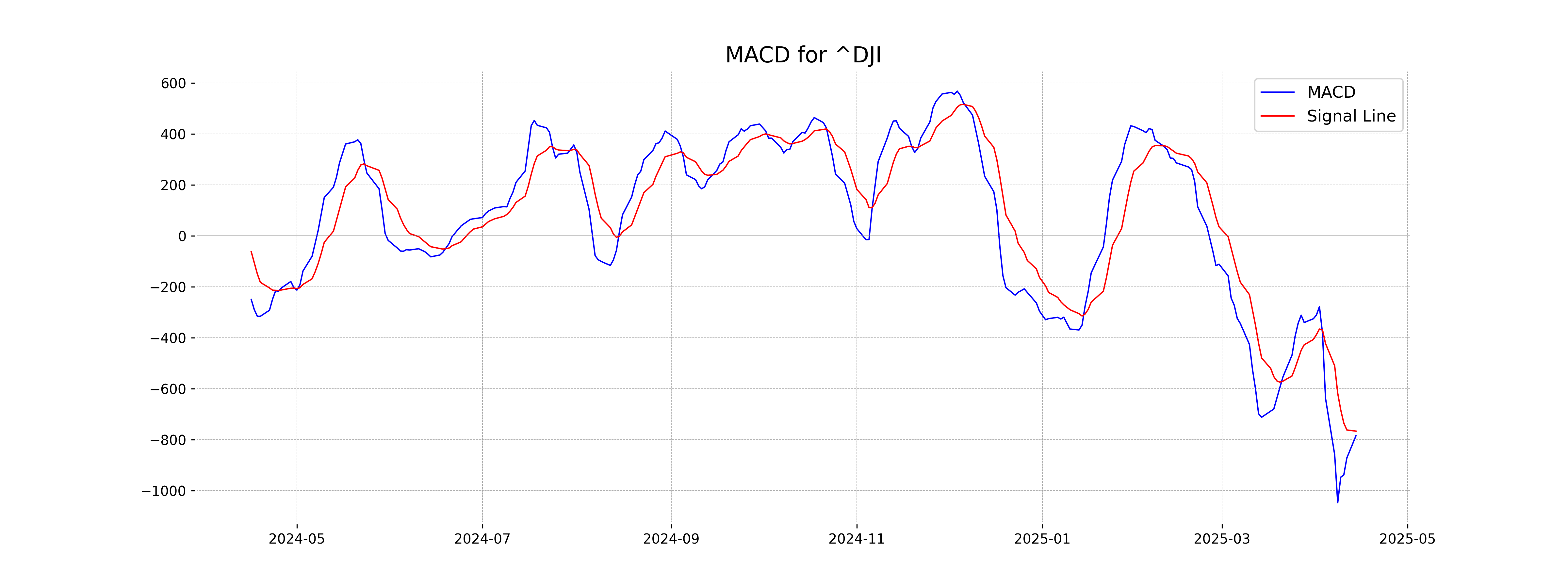 The MACD for Dow Jones Industrial Average (US) is negative at -784.09, indicating a bearish trend. The MACD is below its signal line of -765.87, suggesting potential downward momentum. Monitor for changes to assess future movement.