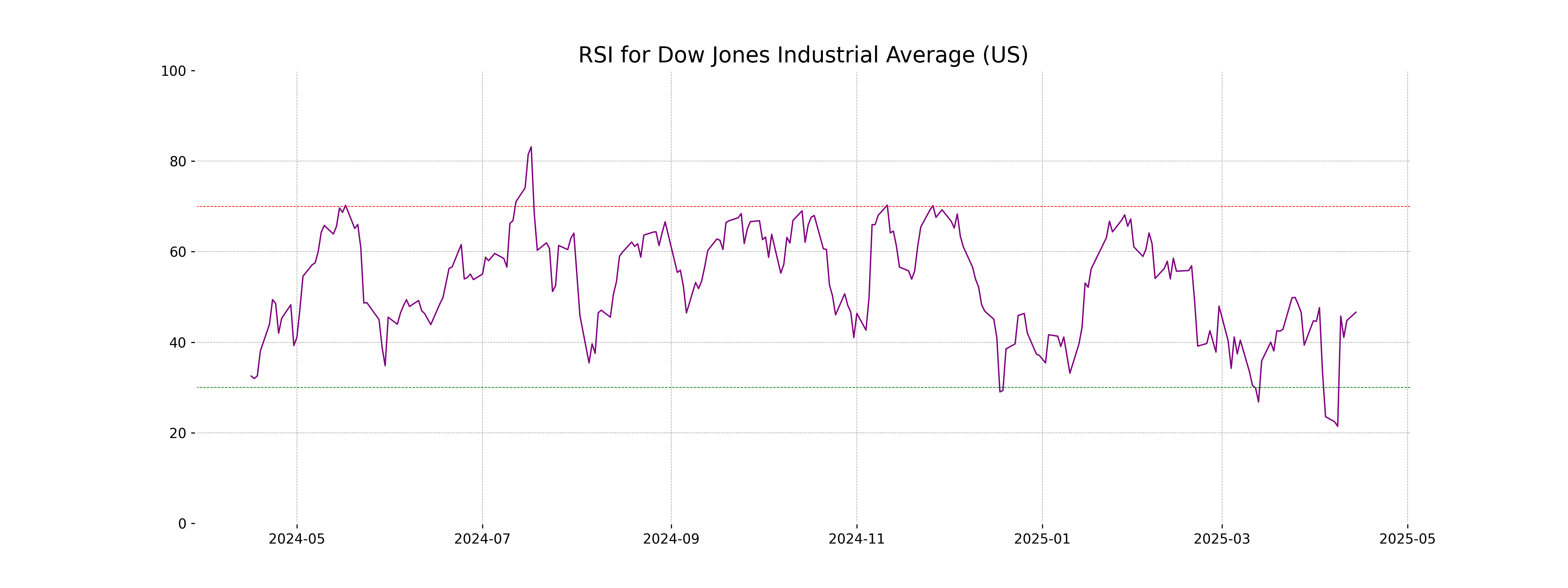 The RSI for the Dow Jones Industrial Average is 46.62, suggesting that the index is in a neutral zone, as it is below 70 but above 30. This indicates that the index is neither overbought nor oversold at the current level.