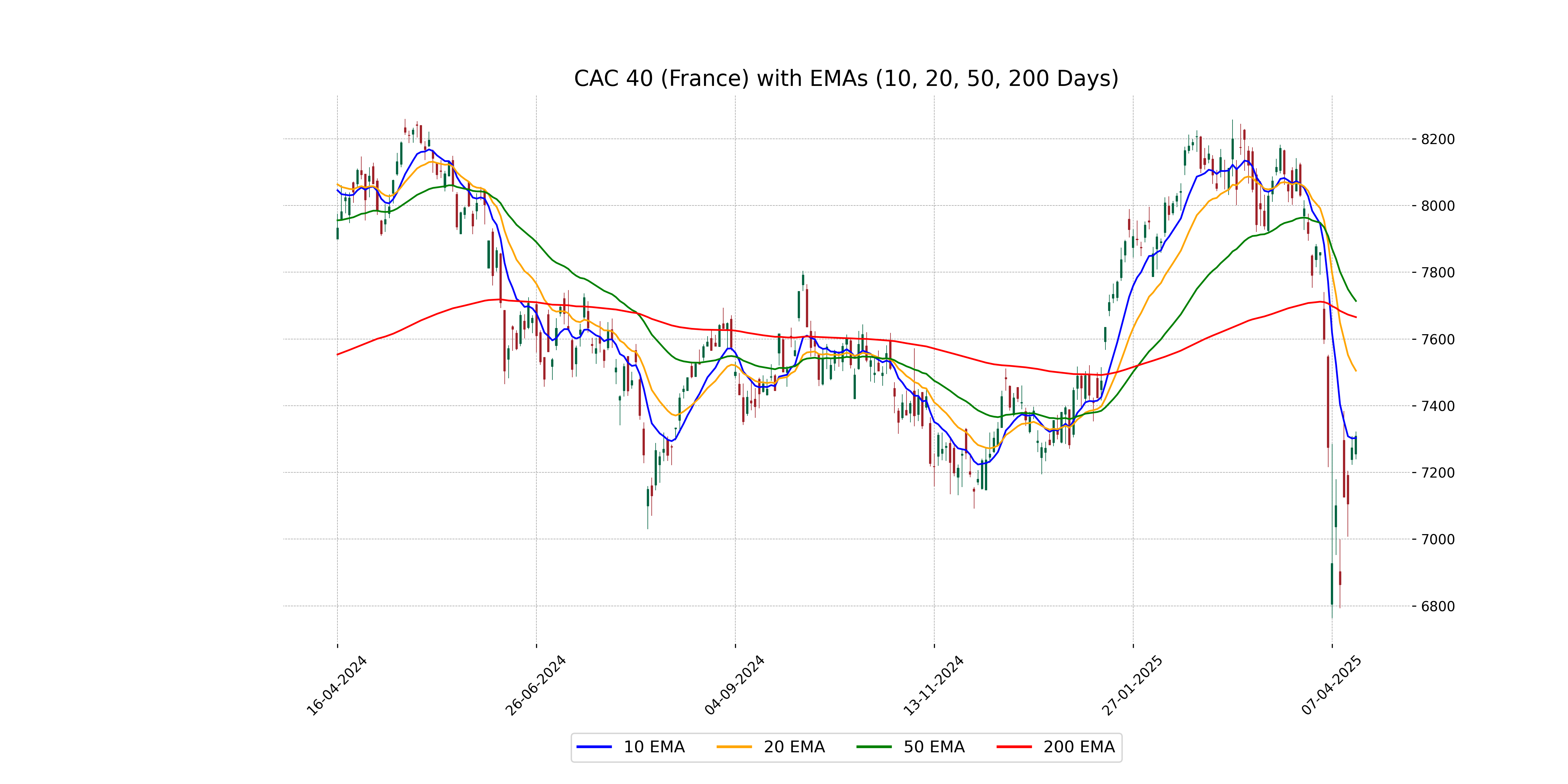 The CAC 40 is currently trading below its 50 EMA and 200 EMA, indicating a potential bearish trend. The current price is slightly above the 10 EMA but well below the 20 EMA, suggesting recent positive momentum hasn't fully shifted the overall trend upwards.