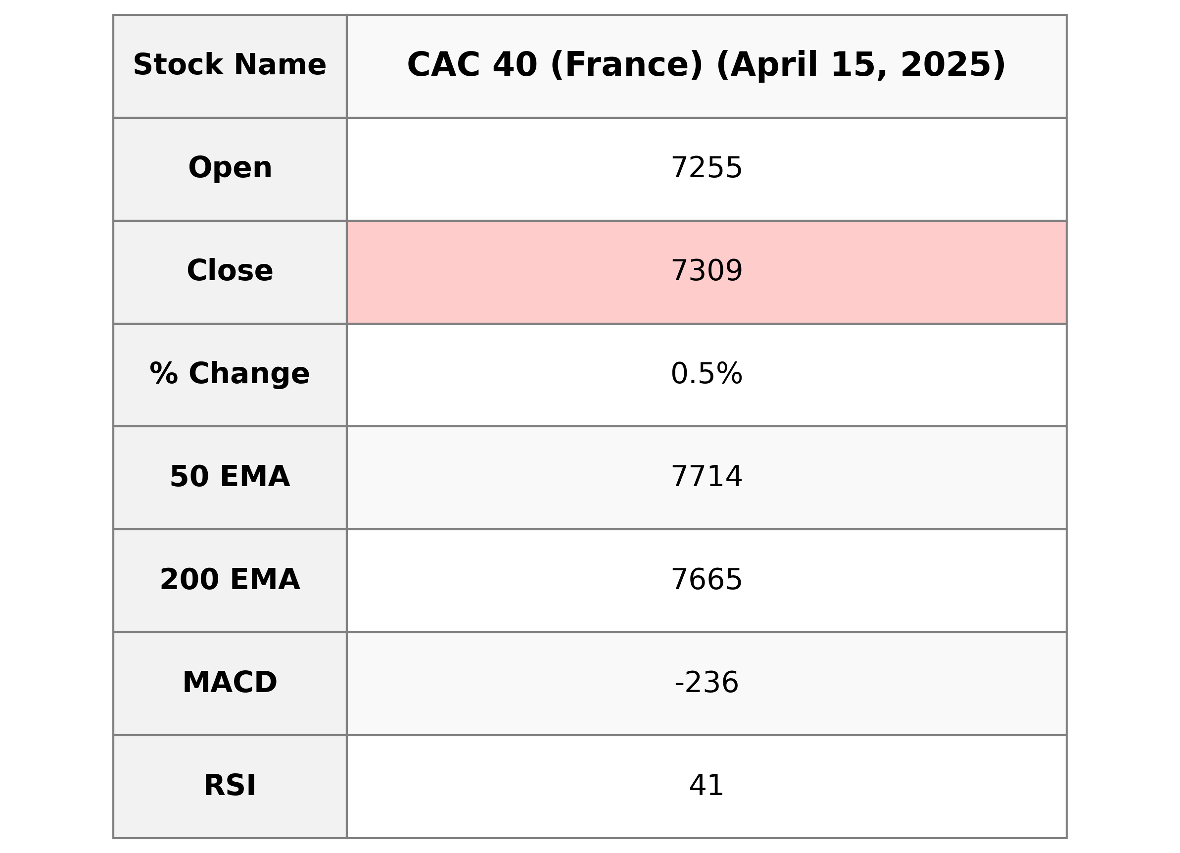 CAC 40 (France) Performance Overview: The CAC 40 index opened at 7,255.06 and closed at 7,309.05, marking a percentage change of 0.49% and a points change of 35.93. The Relative Strength Index (RSI) is at 41.09, indicating weaker momentum, and the MACD shows a negative value of -235.98, suggesting a bearish trend in comparison to the MACD signal. The trading volume for the day was recorded as 0.0, and there is insufficient data on market cap and earnings.