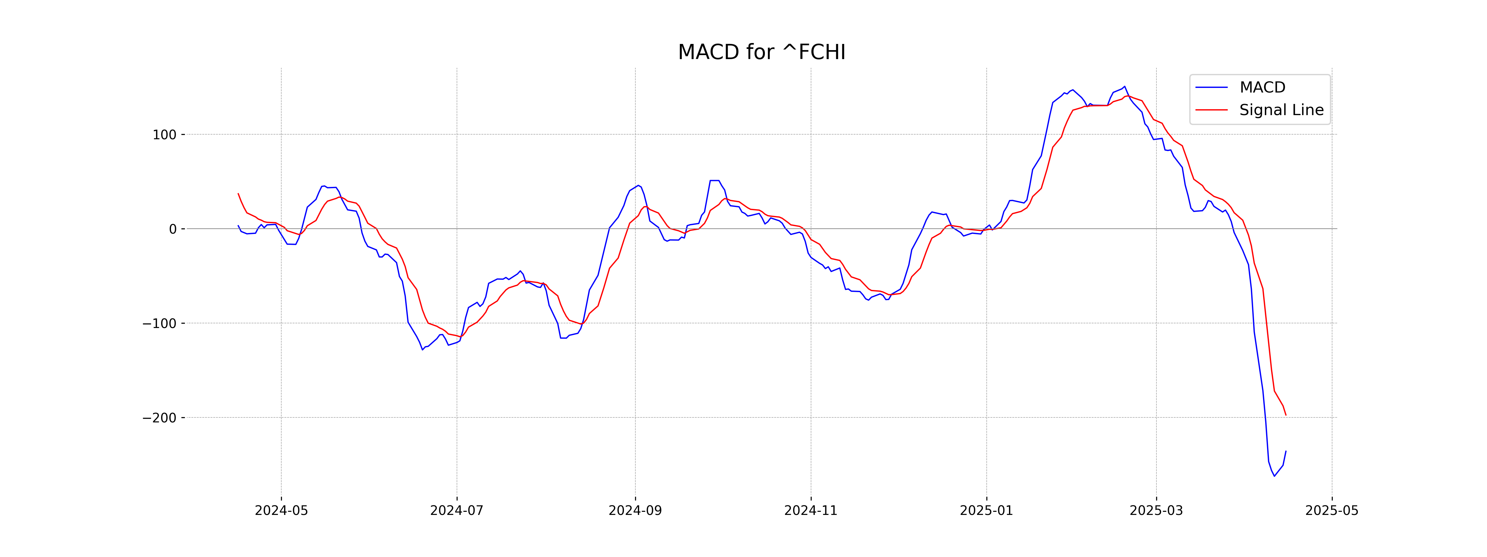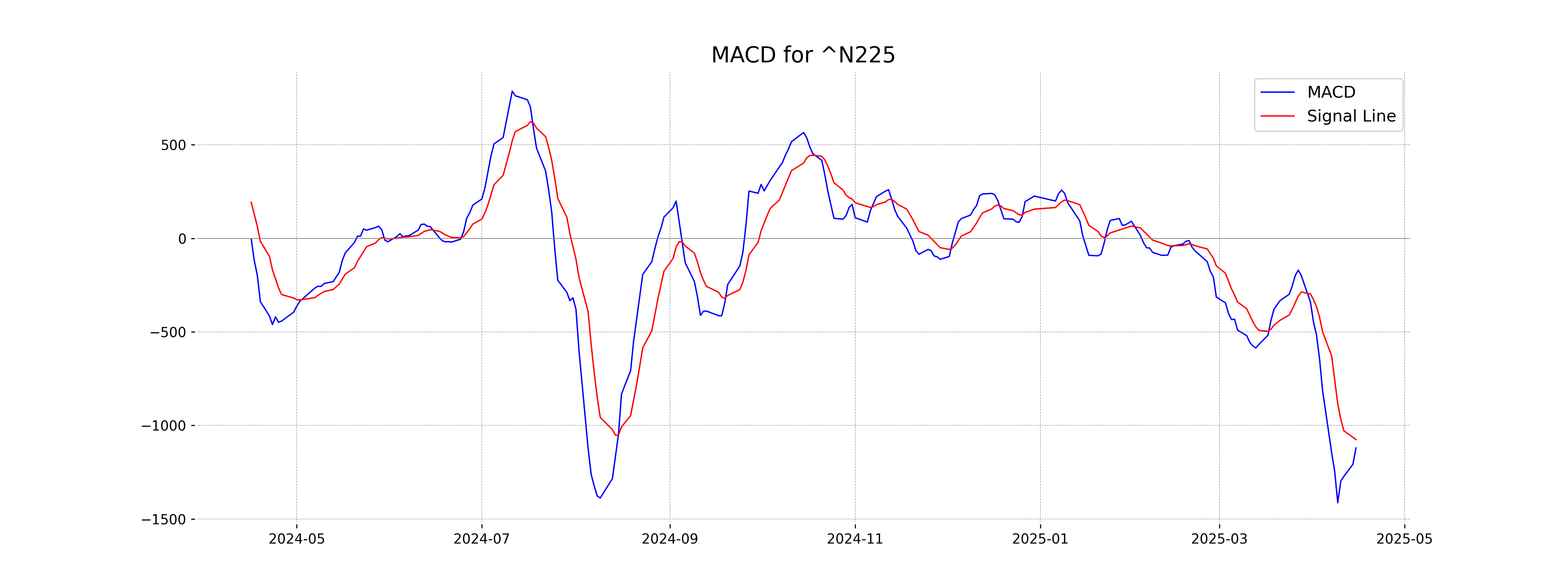 The MACD for Nikkei 225 is -1120.22, with a signal line of -1075.38, indicating a bearish trend as the MACD line is below the signal line. This suggests that the momentum is currently negative, and the index might continue facing selling pressure.