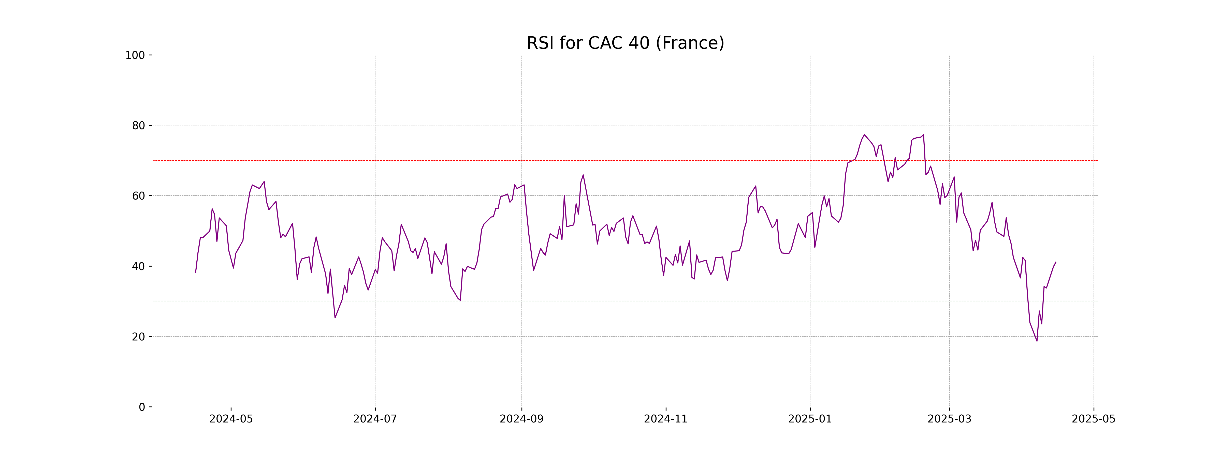The Relative Strength Index (RSI) for CAC 40 (France) is 41.09, indicating that the index is currently in a neutral zone. Typically, an RSI reading below 30 suggests that an asset is oversold, while a reading above 70 indicates that it is overbought. Based on the current RSI, the CAC 40 is neither oversold nor overbought, suggesting a balanced momentum in the market.