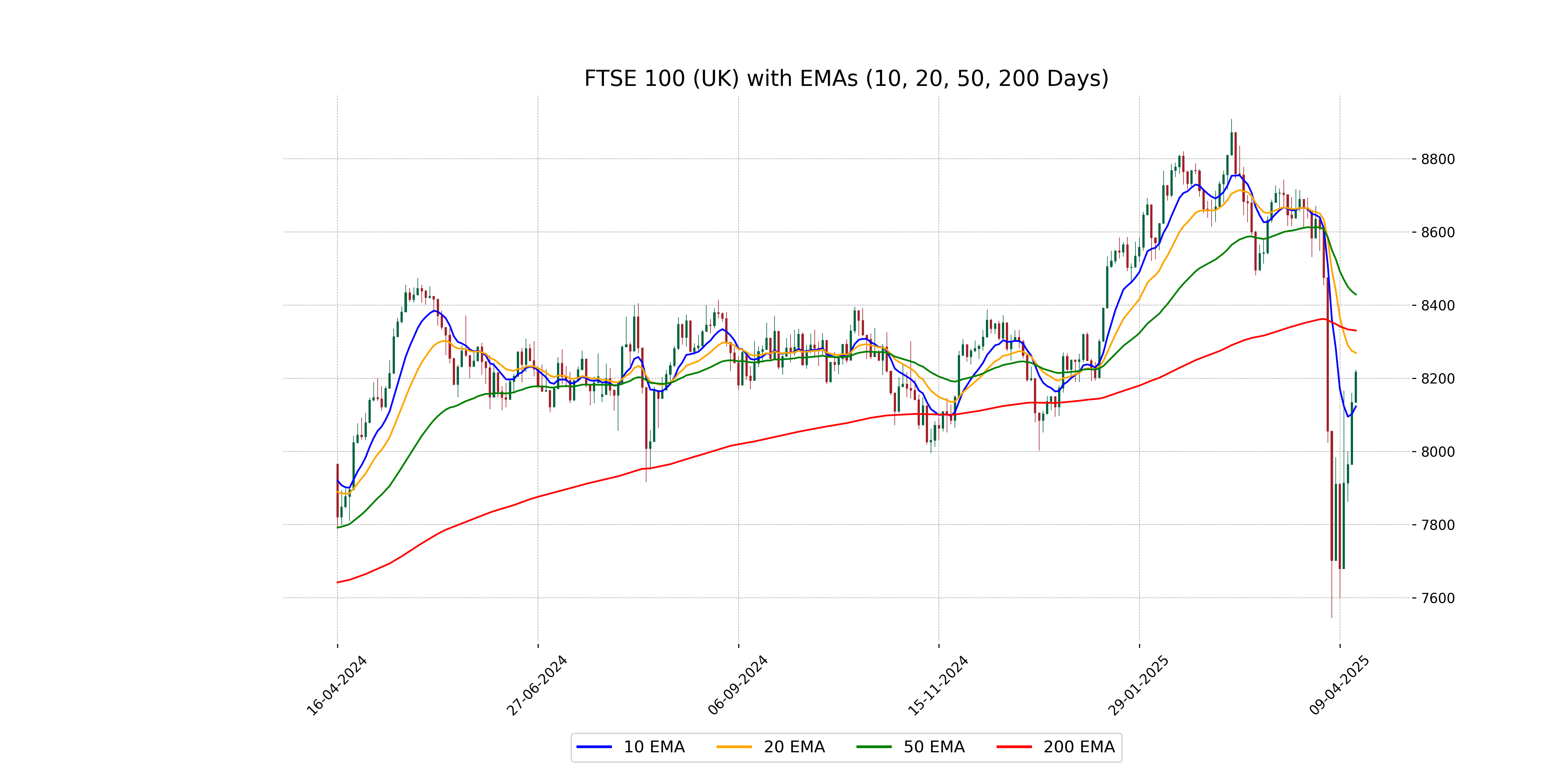FTSE 100 (UK) is currently trading below its 50-day EMA of 8429.05 and its 200-day EMA of 8330.61, indicating a possible bearish trend. However, it is above its 10-day EMA of 8122.98 and approaching its 20-day EMA of 8269.35, which may suggest some short-term bullish momentum.