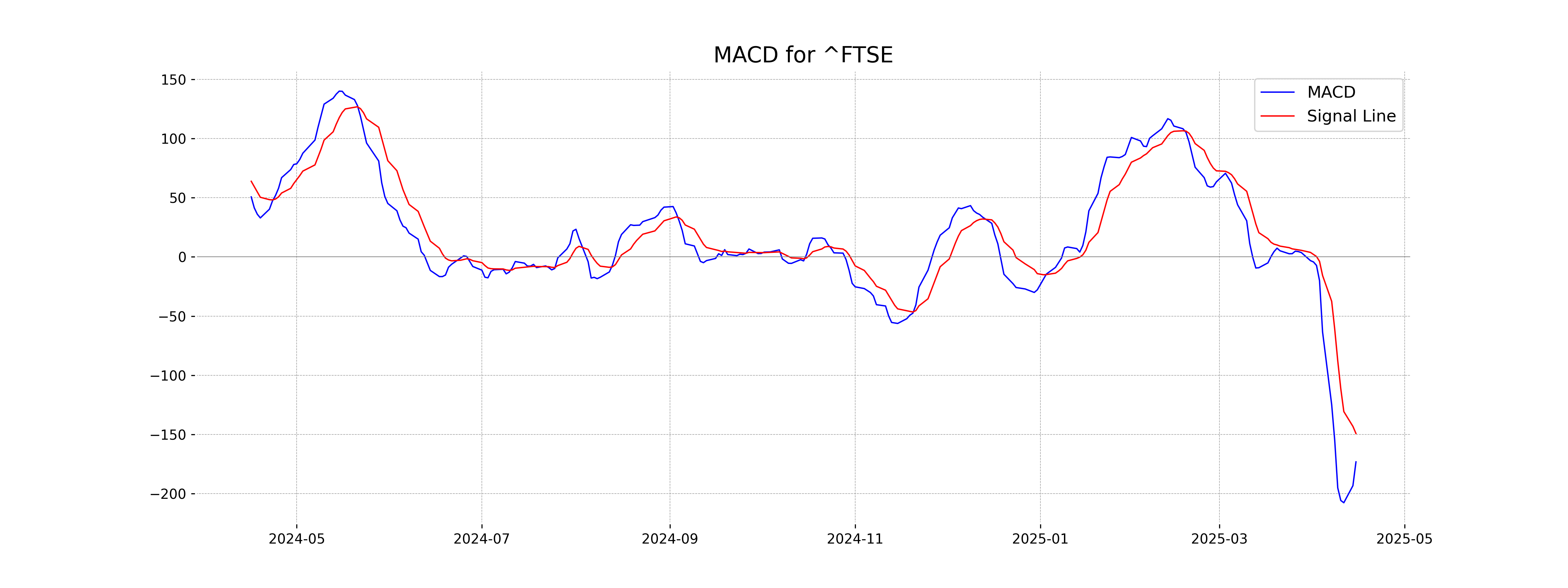 The RSI for the FTSE 100 is currently at 45.97, which suggests a neutral stance, indicating neither overbought nor oversold conditions. This level implies there's room for upward or downward movement if other market factors change.