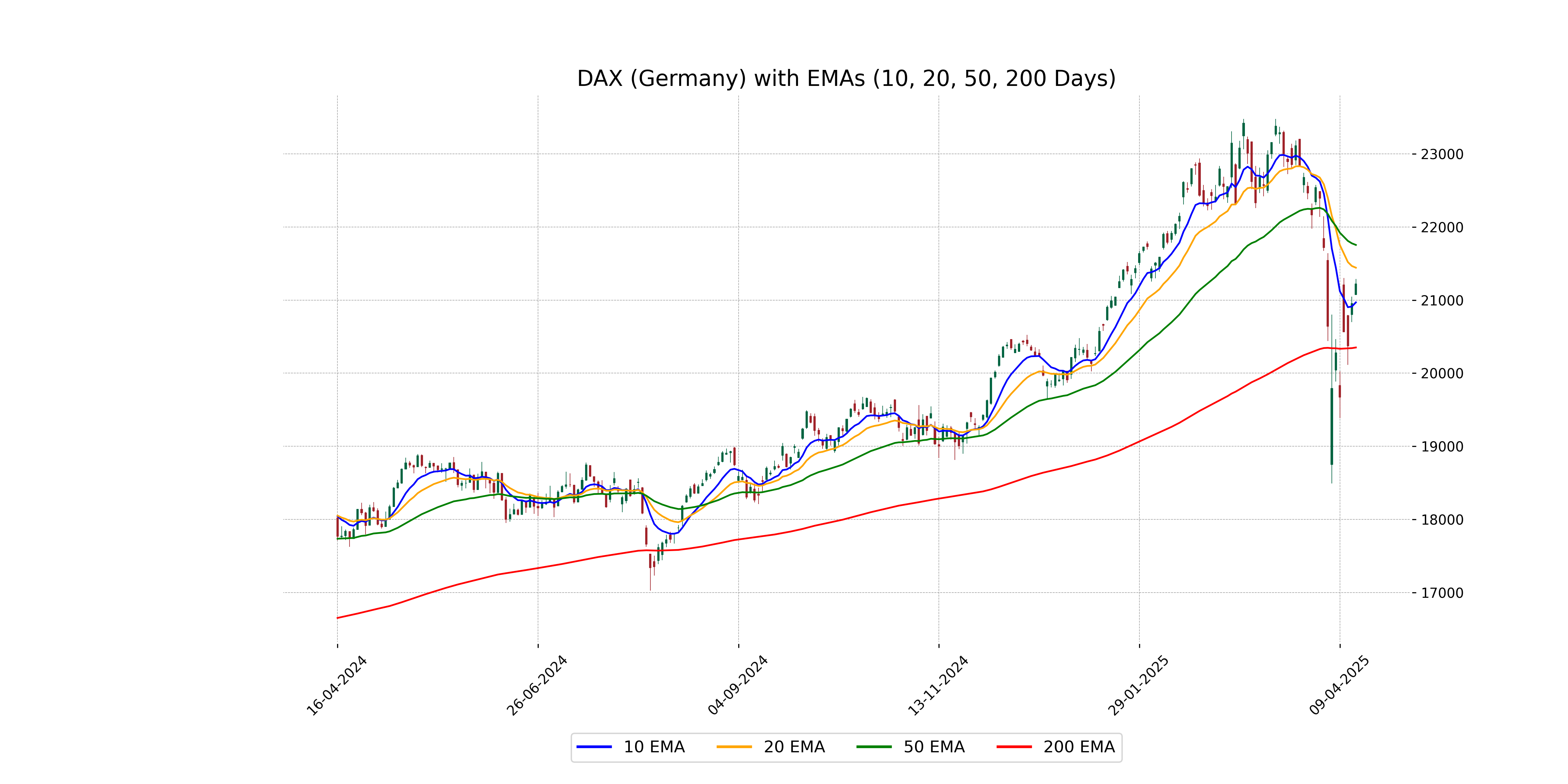 The DAX (Germany) closed higher than its open, with a closing price of 21,222.98 and a percentage change increase of 1.28%. The 10 EMA (20,968.40) is slightly below the close, while the 50 EMA (21,754.02) and 20 EMA (21,442.63) are above. The 200 EMA (20,351.35) is below the current close, indicating potential short-term support, though the MACD trend indicates a bearish momentum.