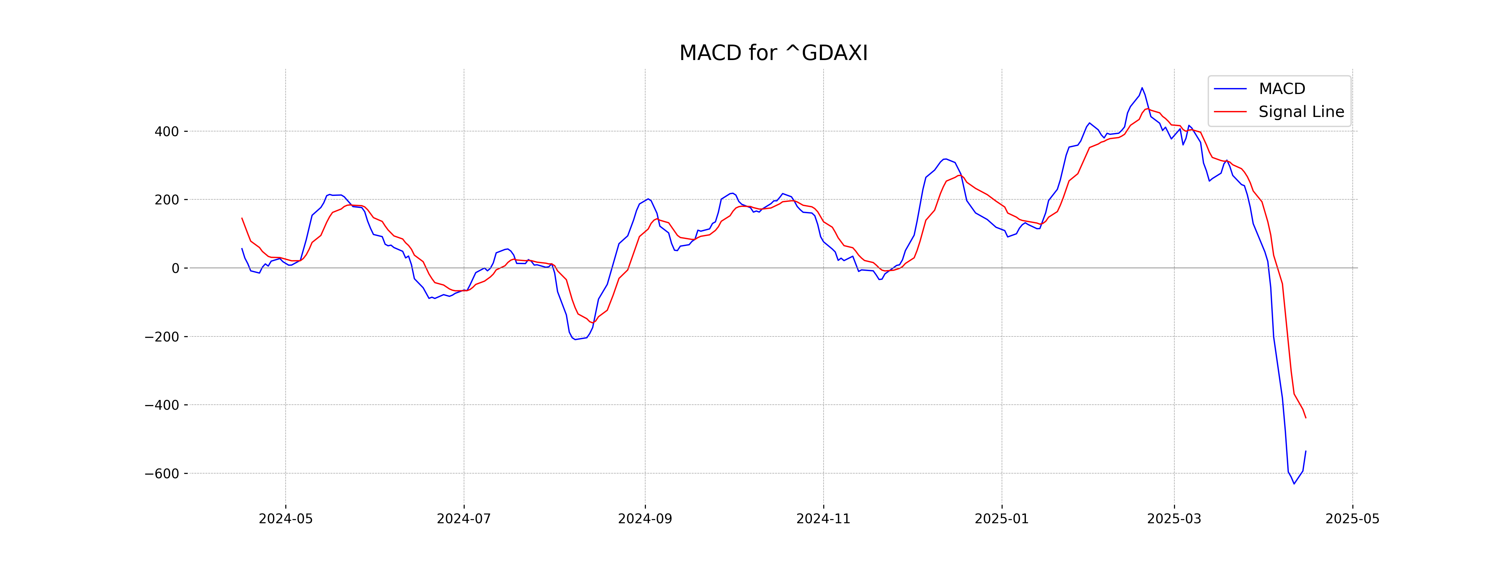 The MACD for DAX (Germany) is currently negative, with a MACD value of -535.92 and a Signal Line of -437.96. This suggests that bearish momentum might be prevalent in the market.