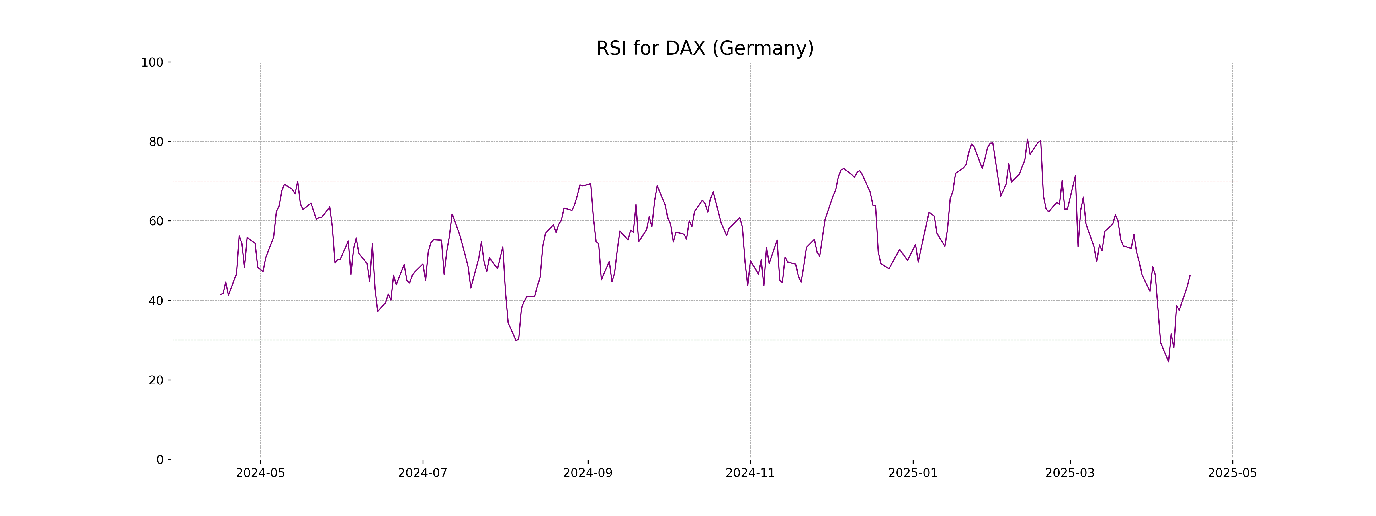 ```text The RSI of DAX (Germany) is 46.18, which suggests that the index is in a neutral zone. It is neither overbought nor oversold, indicating balanced momentum. Monitoring changes in RSI can help predict potential market movements. ```