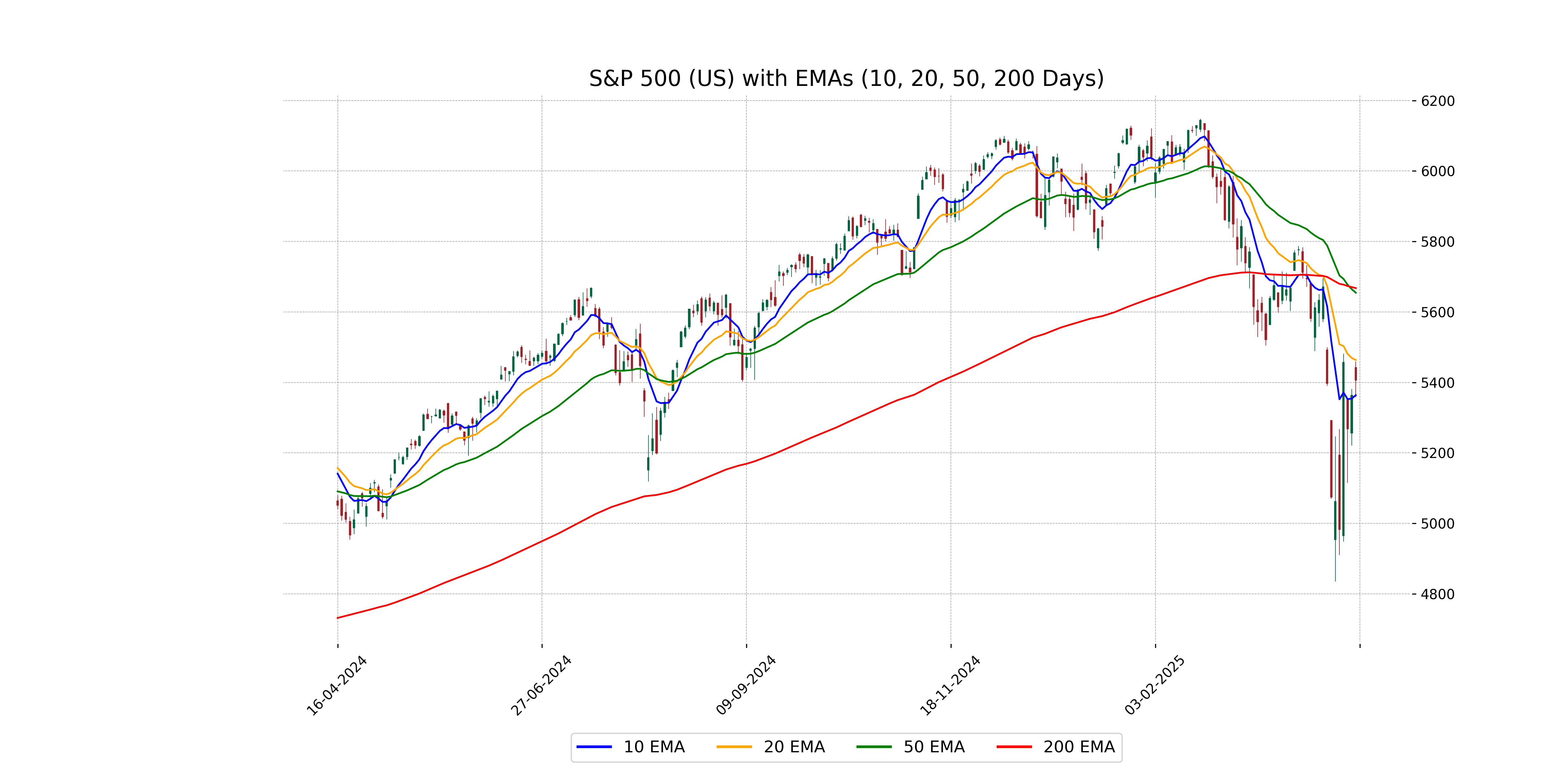 The S&P 500 is currently trading below its 50-day EMA (5654.57) and 200-day EMA (5667.74), indicating a bearish trend over the medium to long term. However, it is slightly above the 10-day EMA (5363.79), suggesting a short-term uptick.