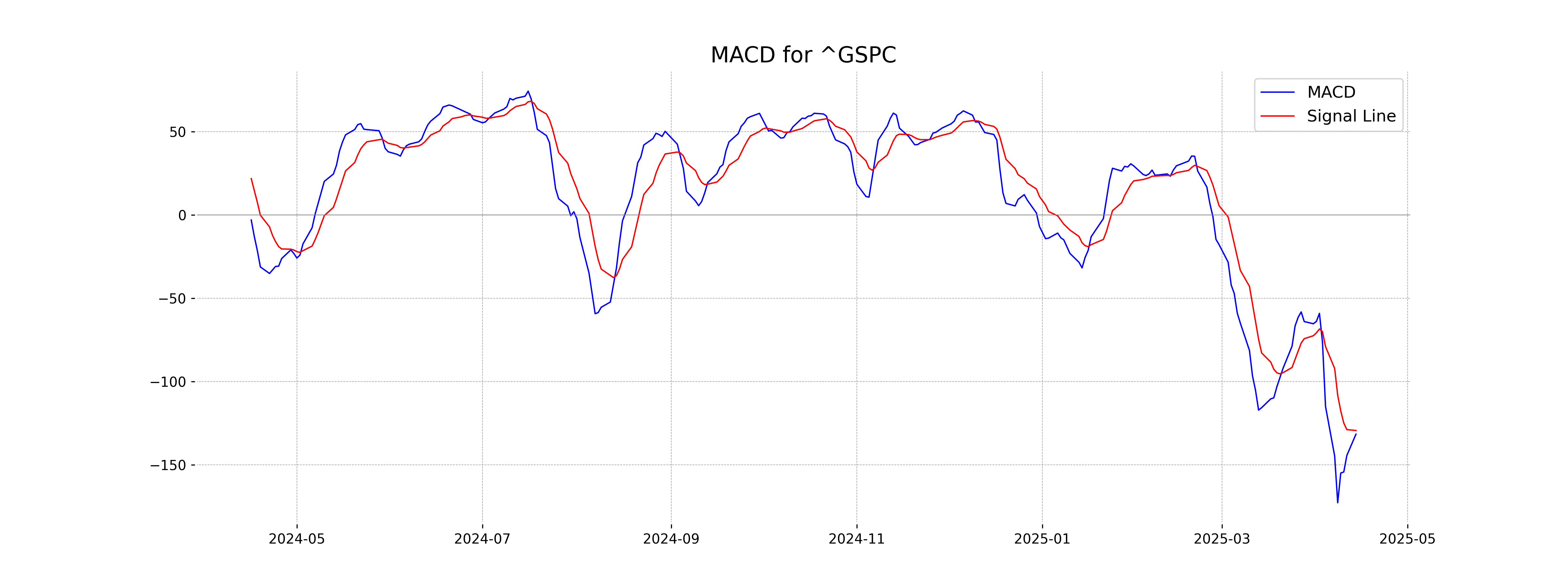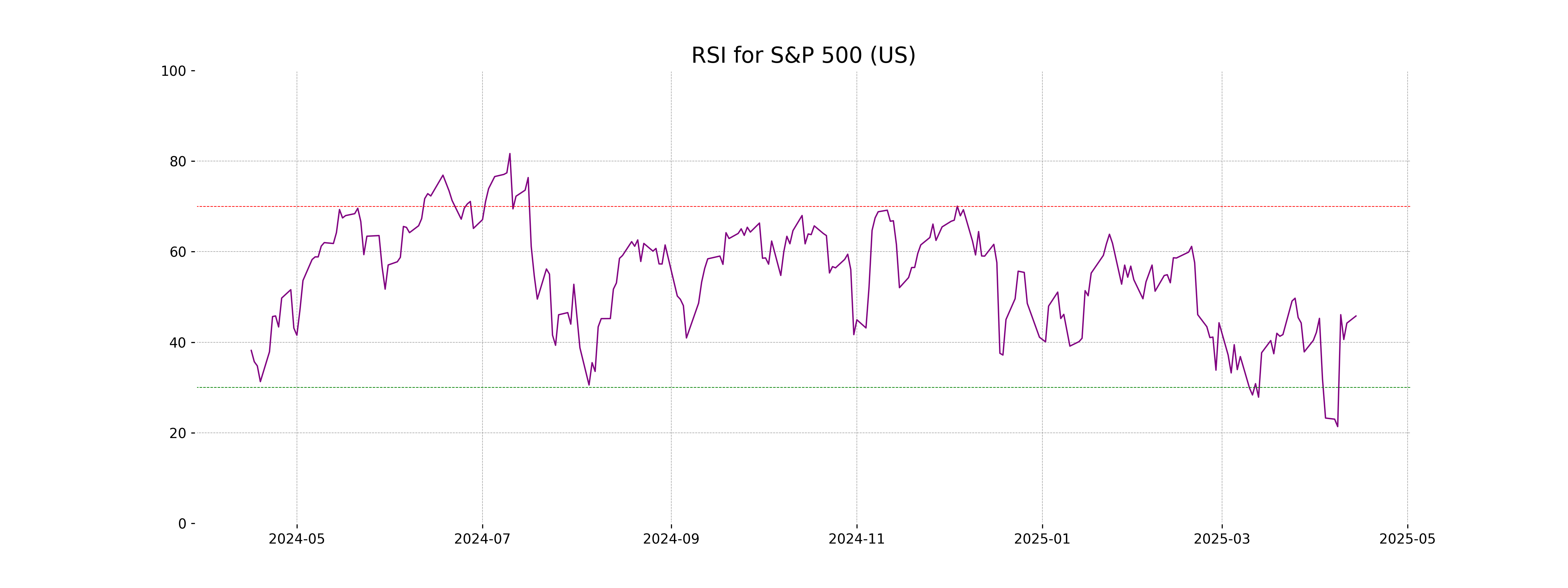 The Relative Strength Index (RSI) for the S&P 500 is 45.79, which is below the typical mid-point of 50. This suggests that the index is neither overbought nor oversold, leaning slightly towards a bearish sentiment.