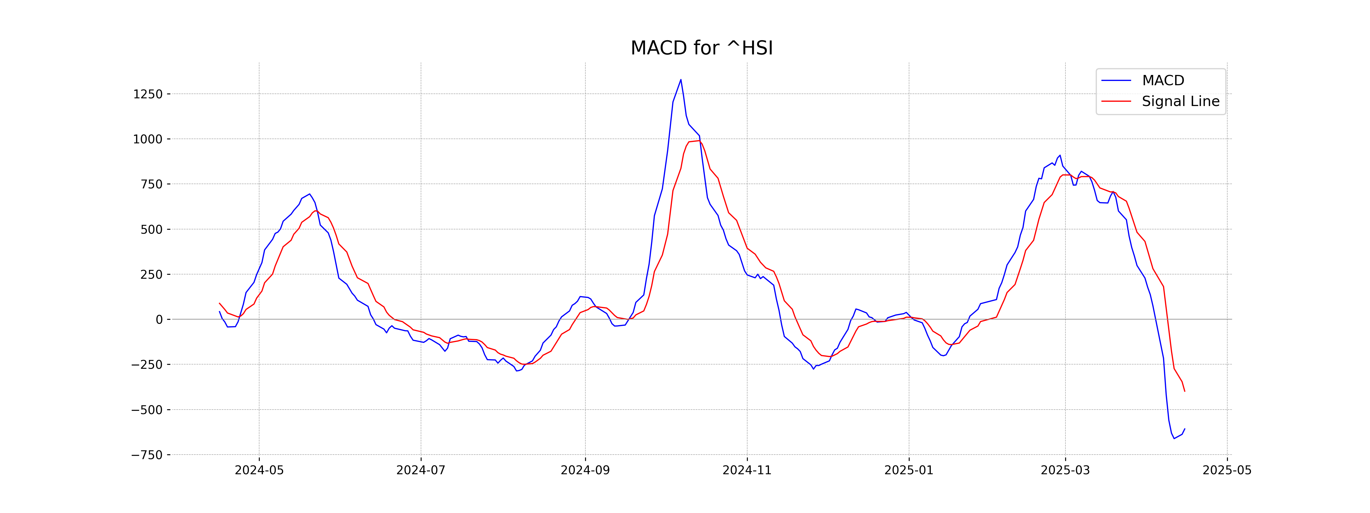 The Hang Seng Index is exhibiting a bearish momentum as indicated by the MACD value of -608.18, which is below the MACD Signal line of -398.90. This suggests a potential continuation of the downward trend, reflecting the recent weakening in the index's performance.