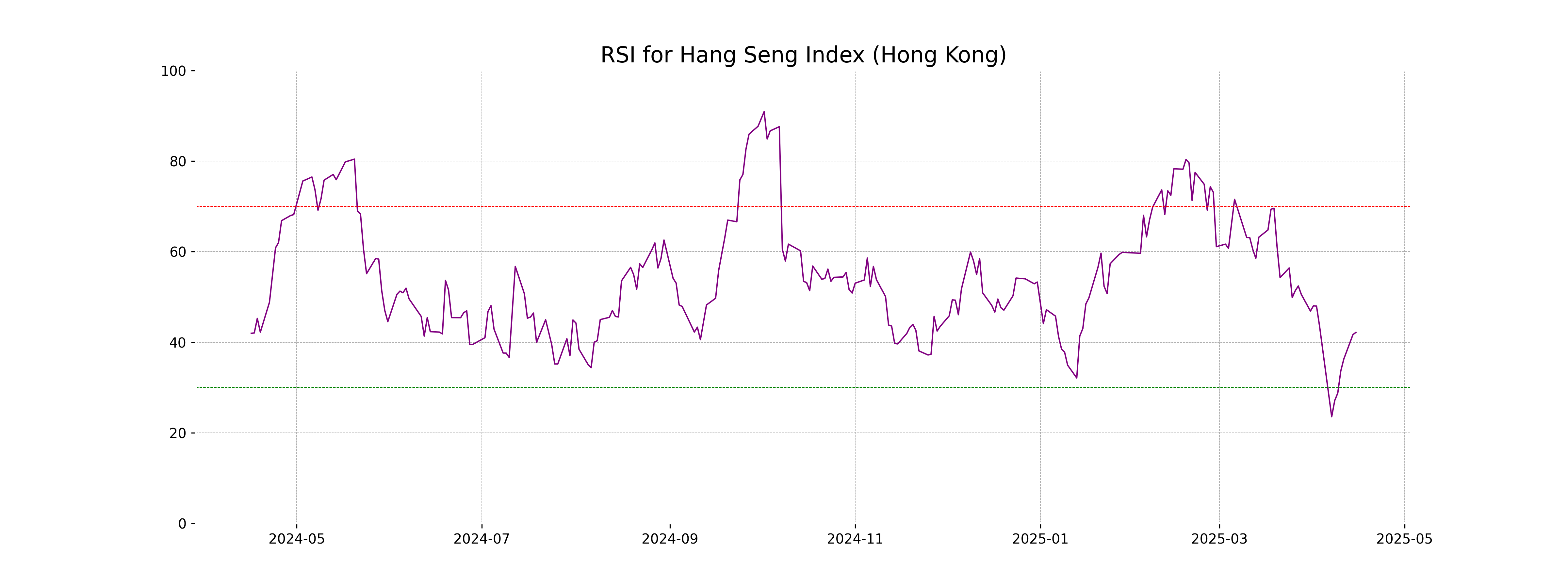 The RSI (Relative Strength Index) for the Hang Seng Index is 42.19. Typically, an RSI below 30 is considered oversold, and above 70 is considered overbought. With an RSI of 42.19, the index is in the neutral zone, suggesting neither strong upward nor downward momentum at this time.