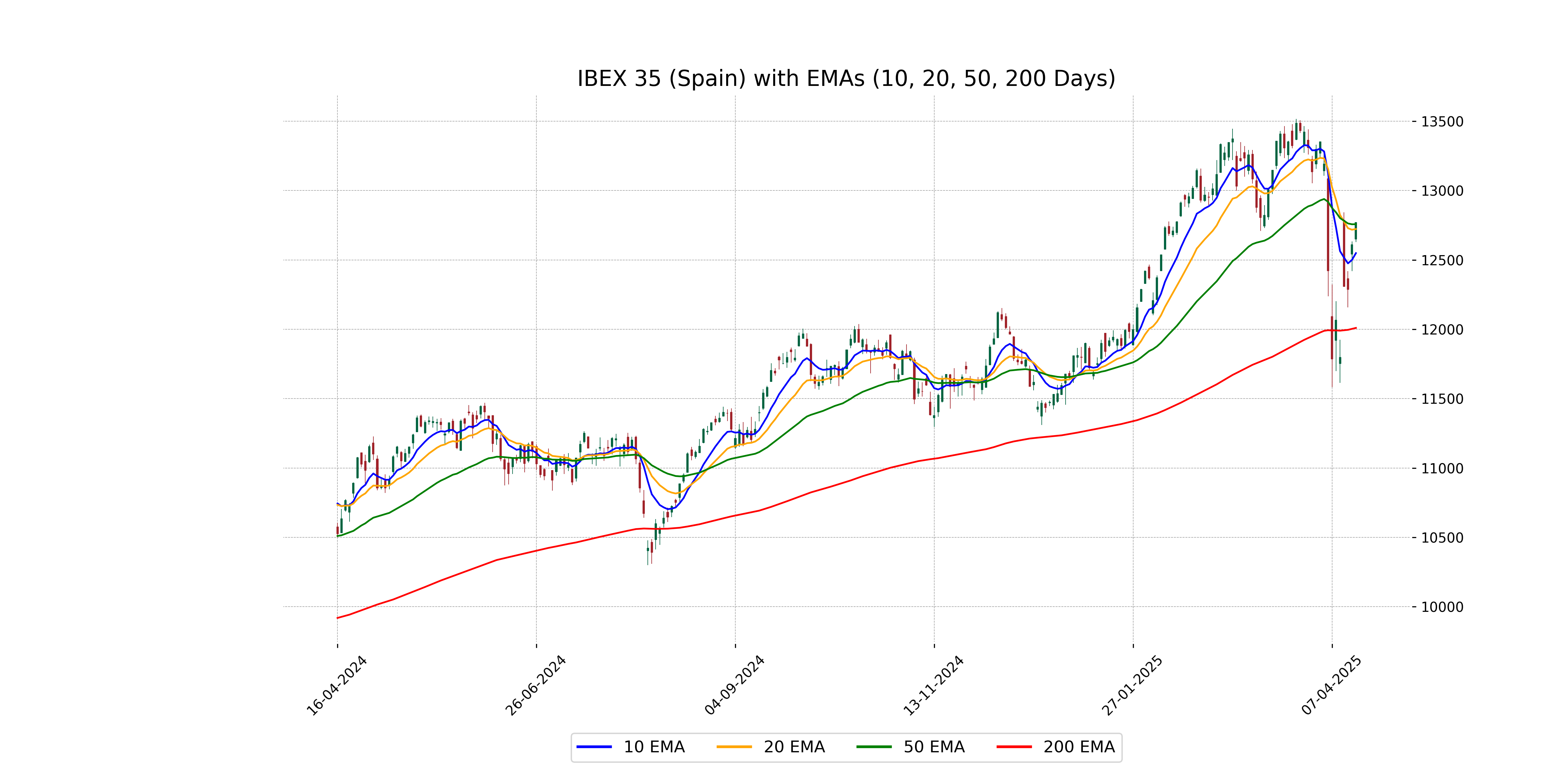 The closing value of IBEX 35 at 12770.10 is above its 10 EMA (12548.55) and 50 EMA (12757.03), indicating short-term upward momentum. However, it is still above its 200 EMA (12009.53), suggesting a strong long-term positive trend.