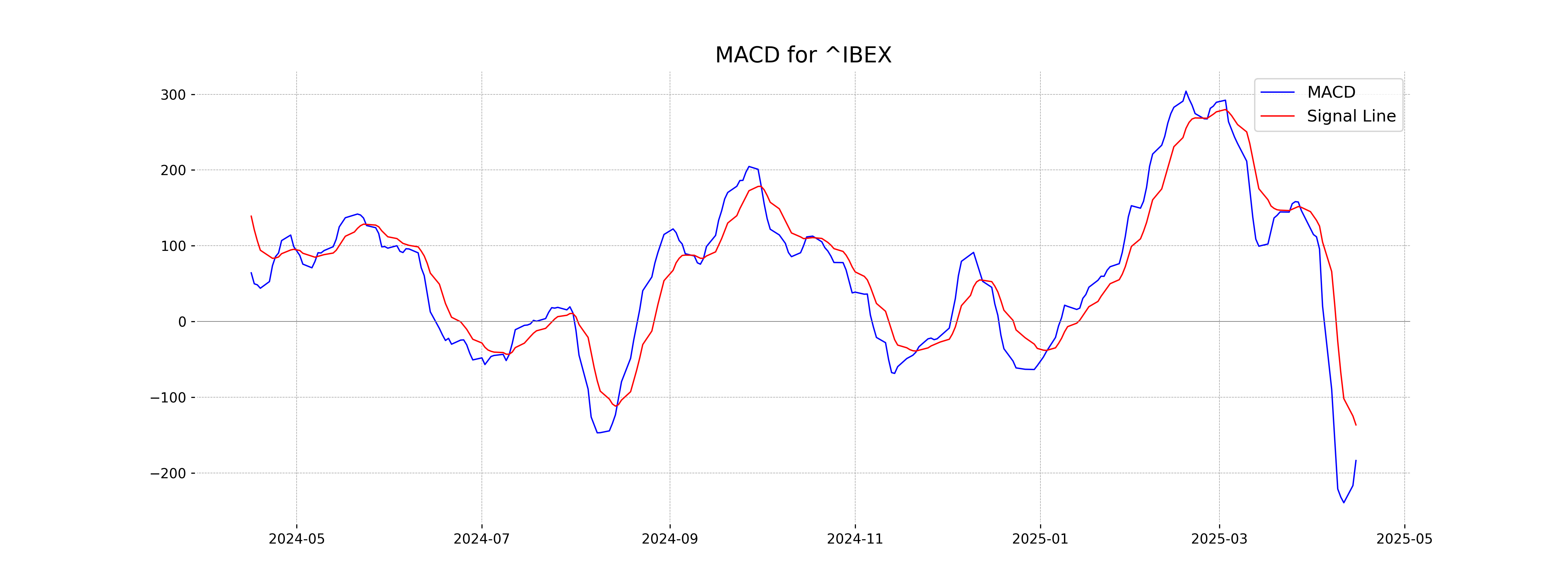 MACD Analysis for IBEX 35 (Spain): The MACD value of -183.66 is below the MACD Signal Line of -136.63, suggesting a bearish trend. This indicates potential continued downward momentum in the near term, and investors may approach with caution.