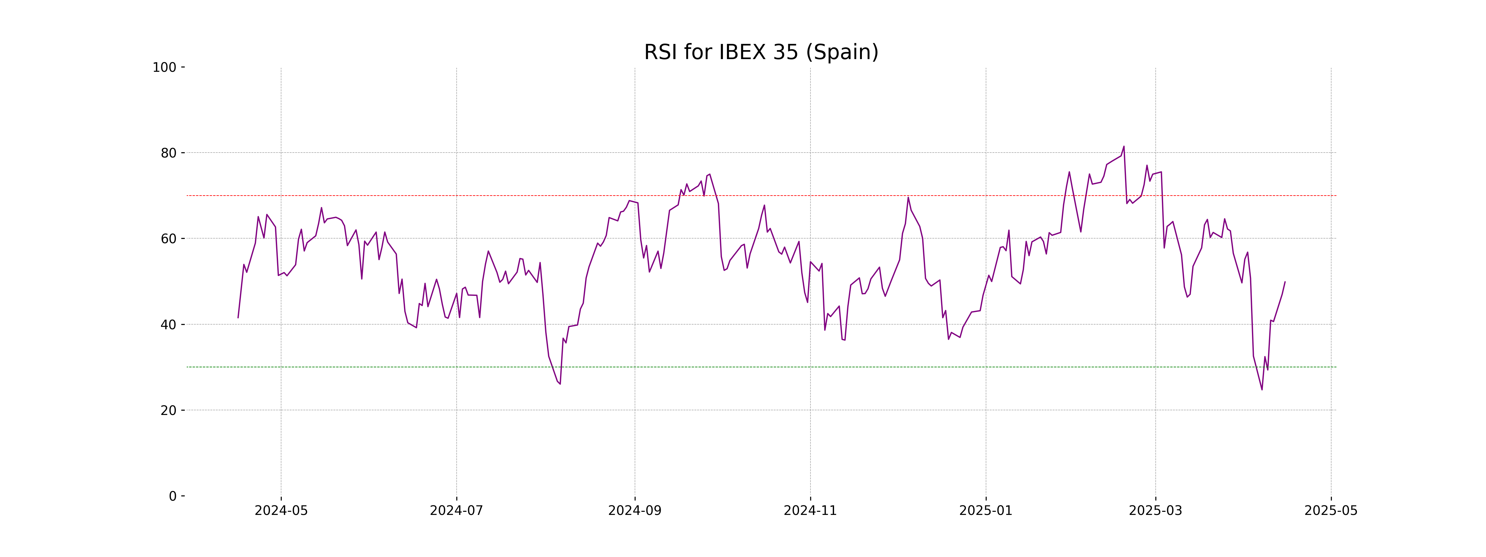 The RSI for IBEX 35 is 49.84, indicating it is in a neutral zone. This suggests that the index is neither overbought nor oversold at the moment. Traders might look for additional indicators to determine potential market trends.