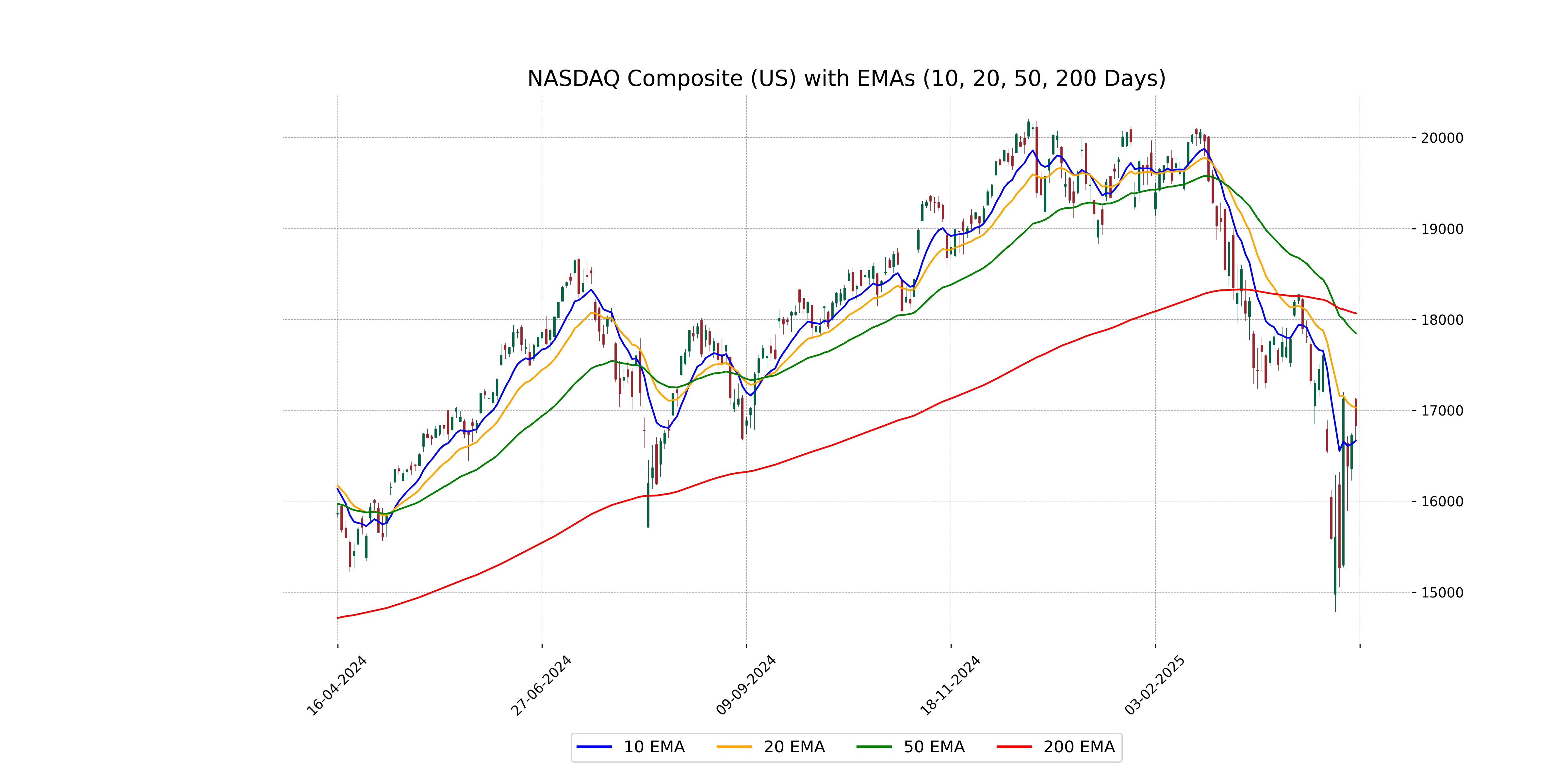 The NASDAQ Composite closed at 16831.48, which is below both its 50-day EMA of 17849.42 and 200-day EMA of 18067.59, indicating a potential bearish trend. However, it remains slightly above the 10-day EMA of 16665.99, suggesting a short-term upward movement.