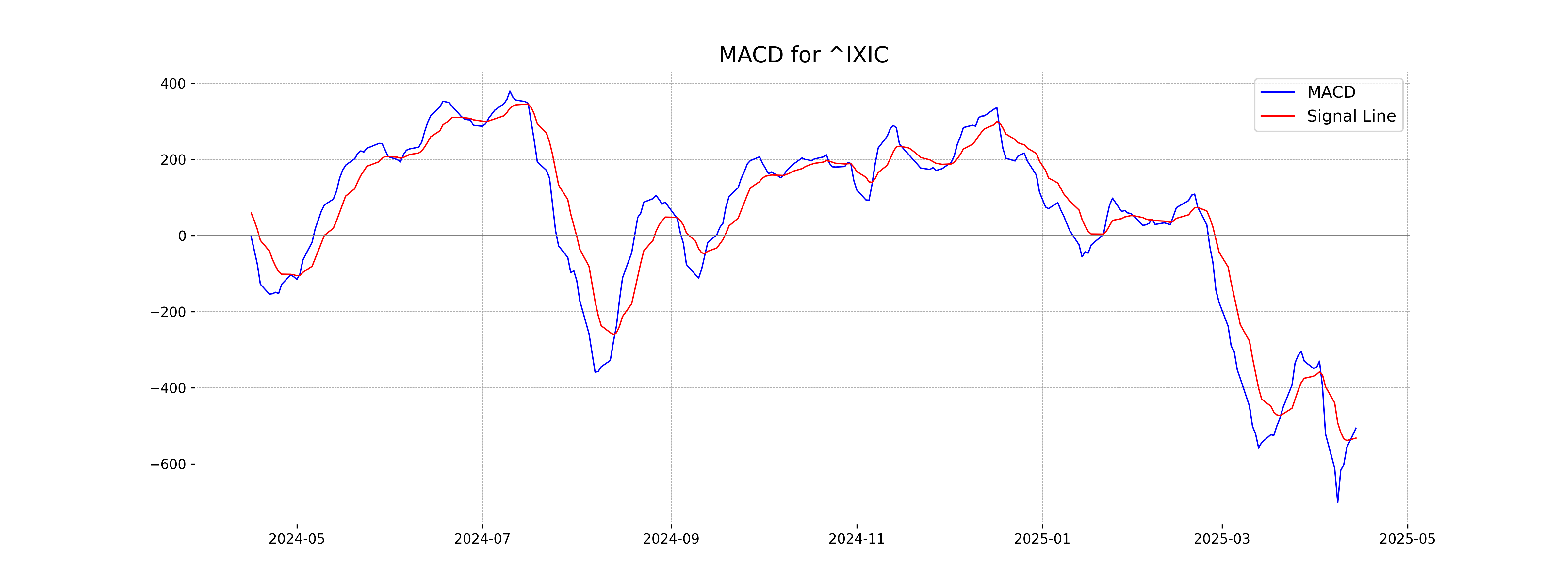 The NASDAQ Composite (US) shows a MACD of -505.80, which is below the MACD Signal of -531.85. This indicates a potentially weak or bearish trend, as the MACD line is approaching the signal line from below.