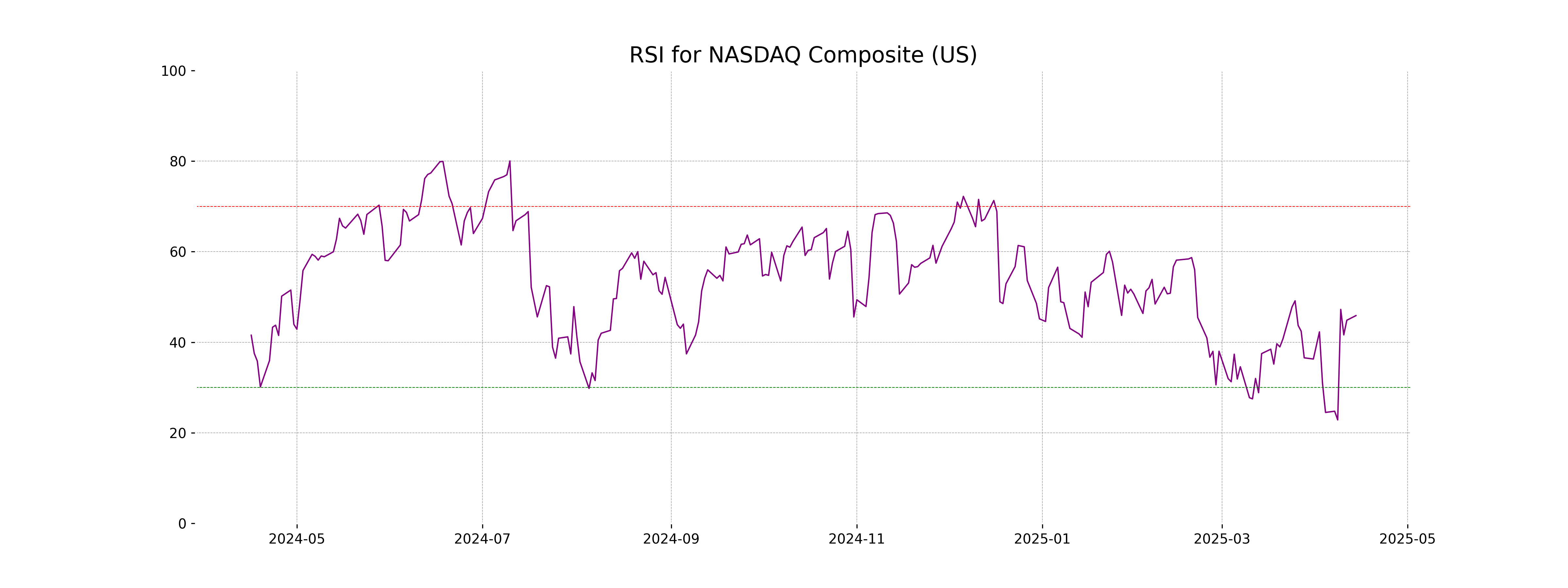 Relative Strength Index (RSI) Analysis for NASDAQ Composite: The RSI value for NASDAQ Composite is 45.88, which suggests that the index is currently in a neutral territory. An RSI below 30 typically indicates oversold conditions, while an RSI above 70 suggests overbought conditions.