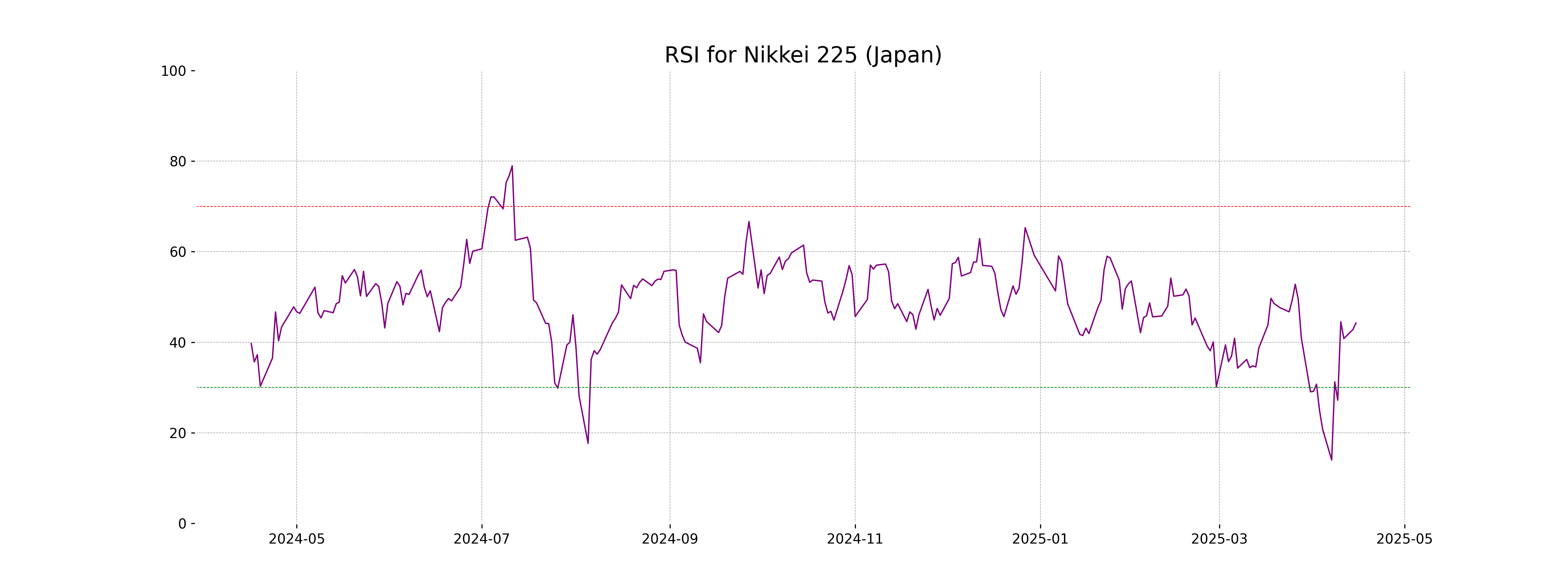 RSI Analysis for Nikkei 225: The RSI is currently at 44.25, indicating a neutral position since it is below 50 but above 30. This suggests that the index is neither in an overbought nor oversold condition, and recent market movements may not signal extreme price changes.