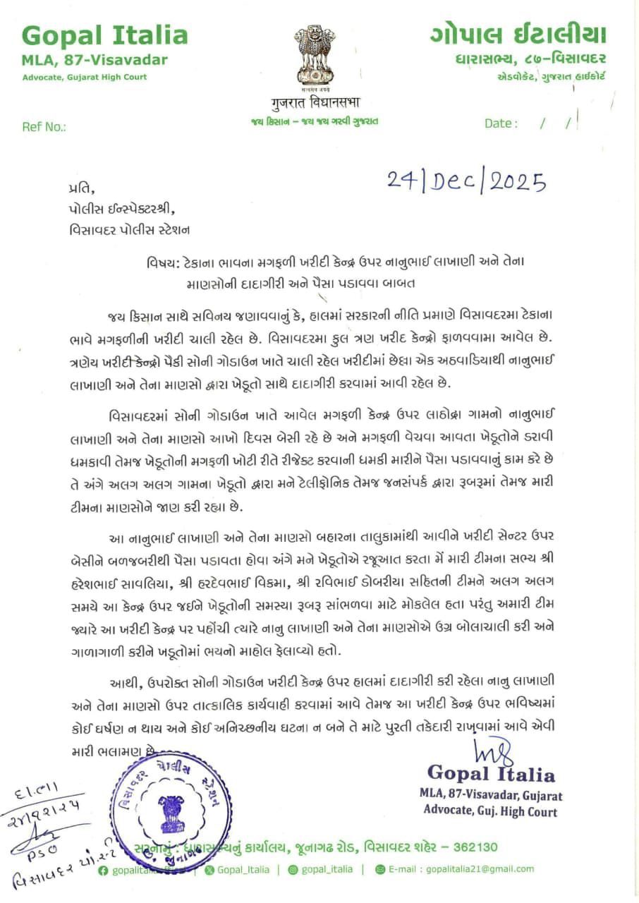 Aam Aadmi Party (AAP) MLA from Visavadar, Gopal Italia, has written to the Police Inspector of Visavadar Police Station alleging instances of bullying and extortion at a minimum support price (MSP) groundnut procurement centre in the town.