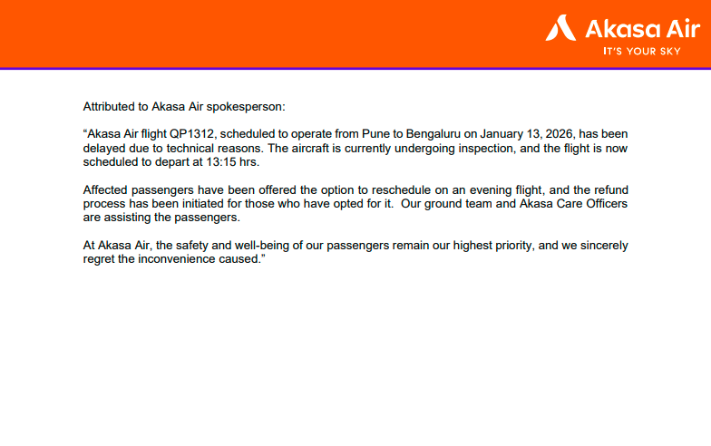 In a communication to the passengers, Akasa Air said the flight QP 1312 was delayed due to technical reasons and added that the flight will now depart at 1.15 pm.