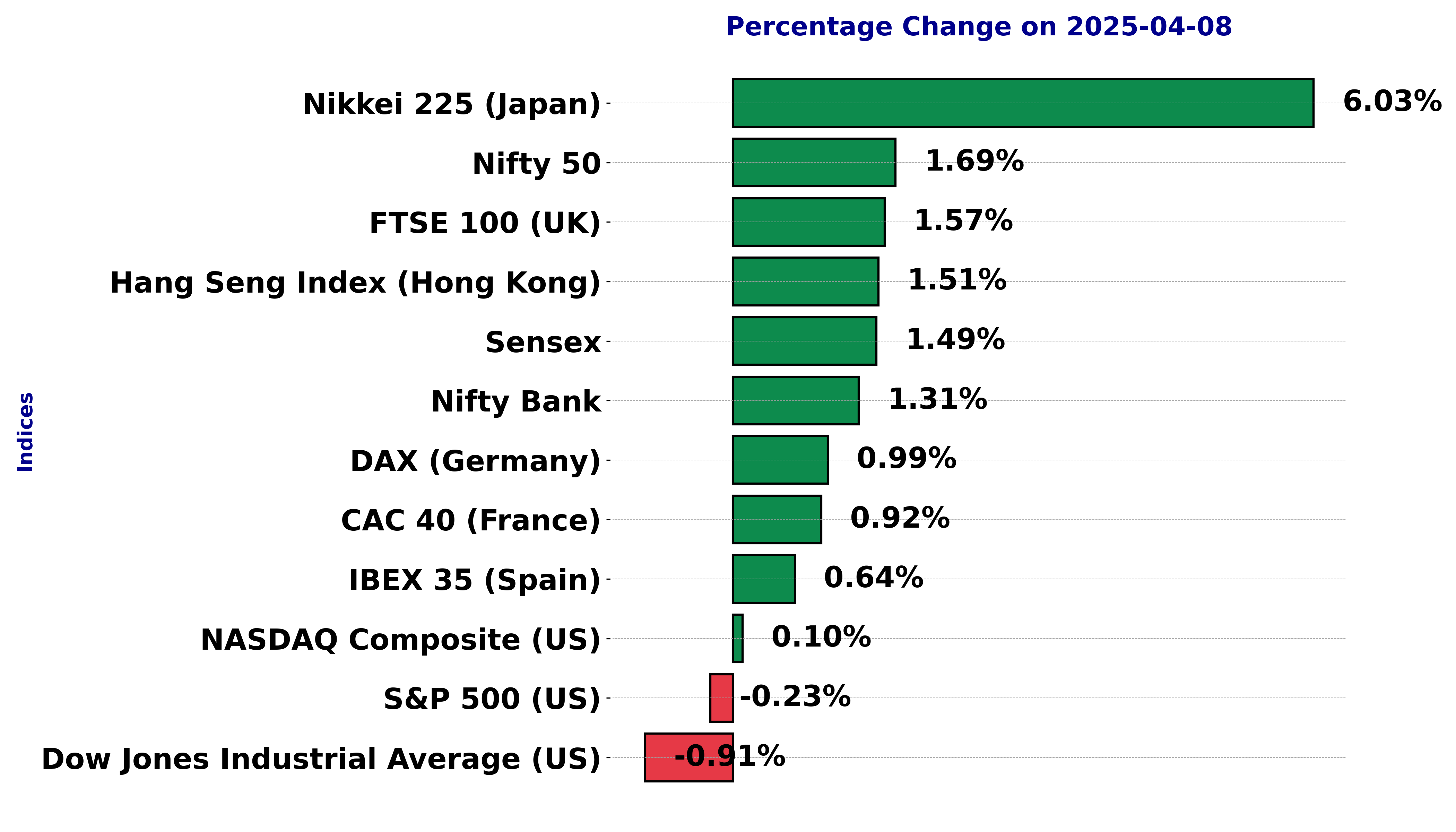 The international stock market indices showed varied performances on April 08, 2025, reflecting the economic sentiment across different regions.
