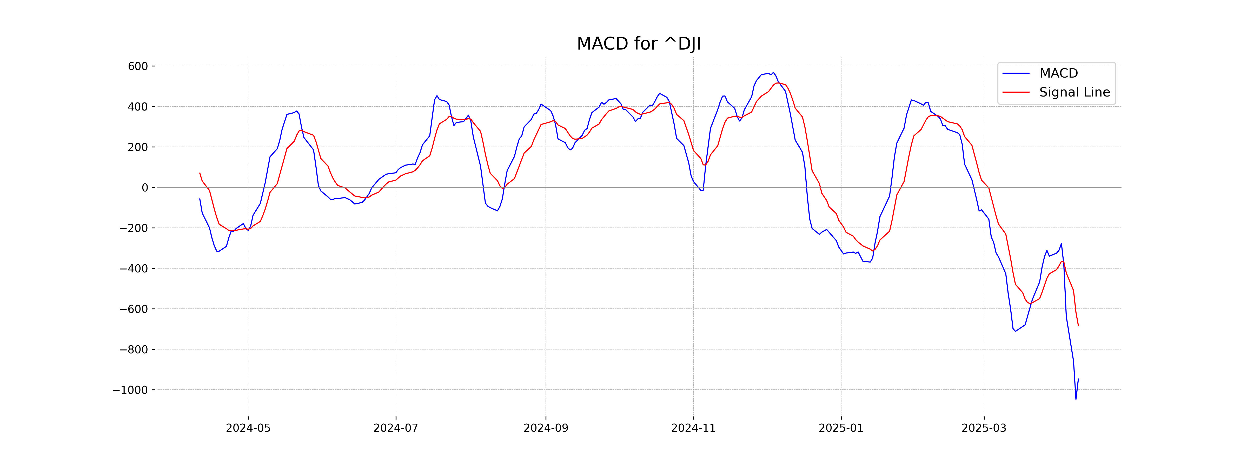 The MACD for the Dow Jones Industrial Average indicates a bearish trend as the MACD value of -946.42 is below the MACD Signal of -682.83. This suggests that the recent momentum might be weak, cautioning investors about potential short-term declines.