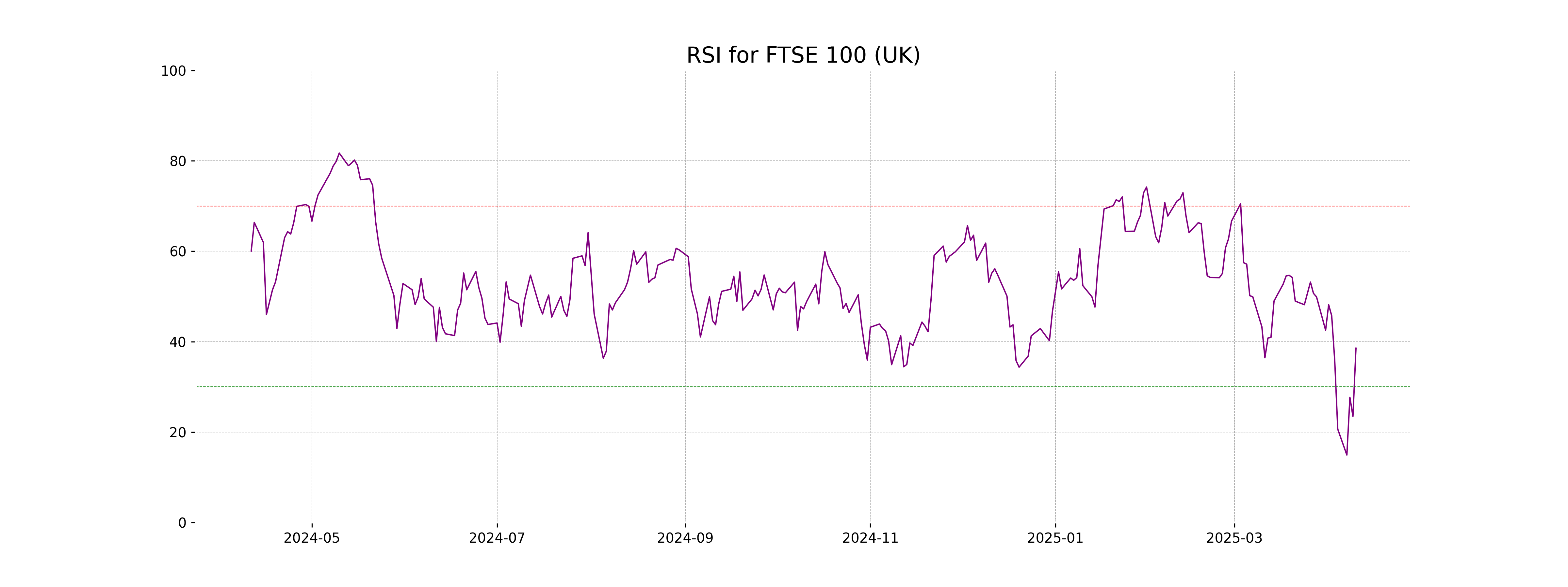 The RSI of the FTSE 100 index is 38.55, suggesting that the market is approaching oversold conditions. Typically, an RSI below 30 is considered oversold, indicating potential for a reversal or a buying opportunity, but at the current level, the index is not significantly oversold.