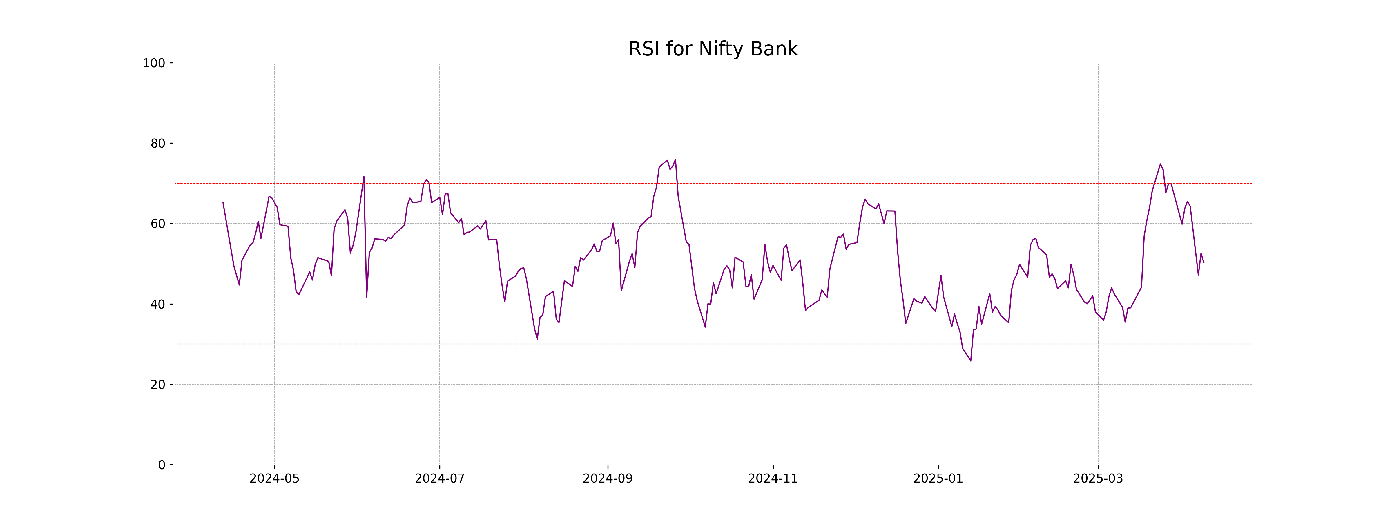 RSI Analysis for Nifty Bank: Based on the provided stock data, the Relative Strength Index (RSI) for Nifty Bank is 50.27. This indicates a neutral trend, as it is around the midpoint of the typical RSI scale from 0 to 100, suggesting that neither strong buying nor selling pressures are currently dominant.