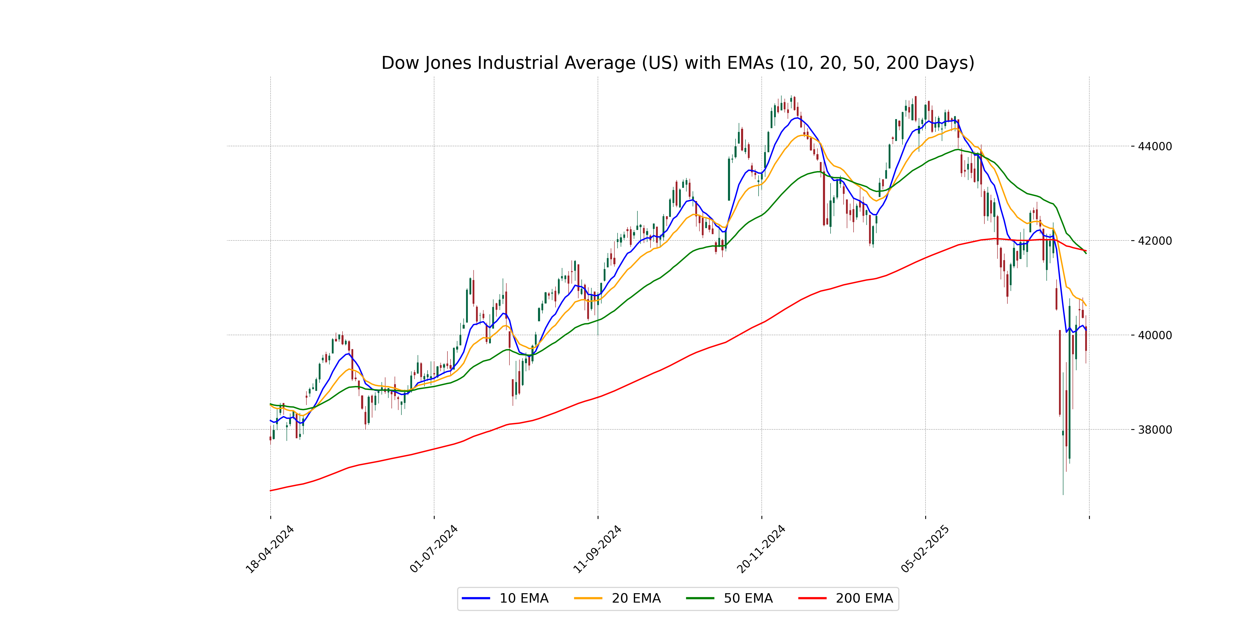 The Dow Jones Industrial Average opened below its 10 EMA and 20 EMA, indicating a bearish sentiment. The closing price of 39669.39 is significantly below all major moving averages (50 EMA and 200 EMA), suggesting continued downward pressure.
