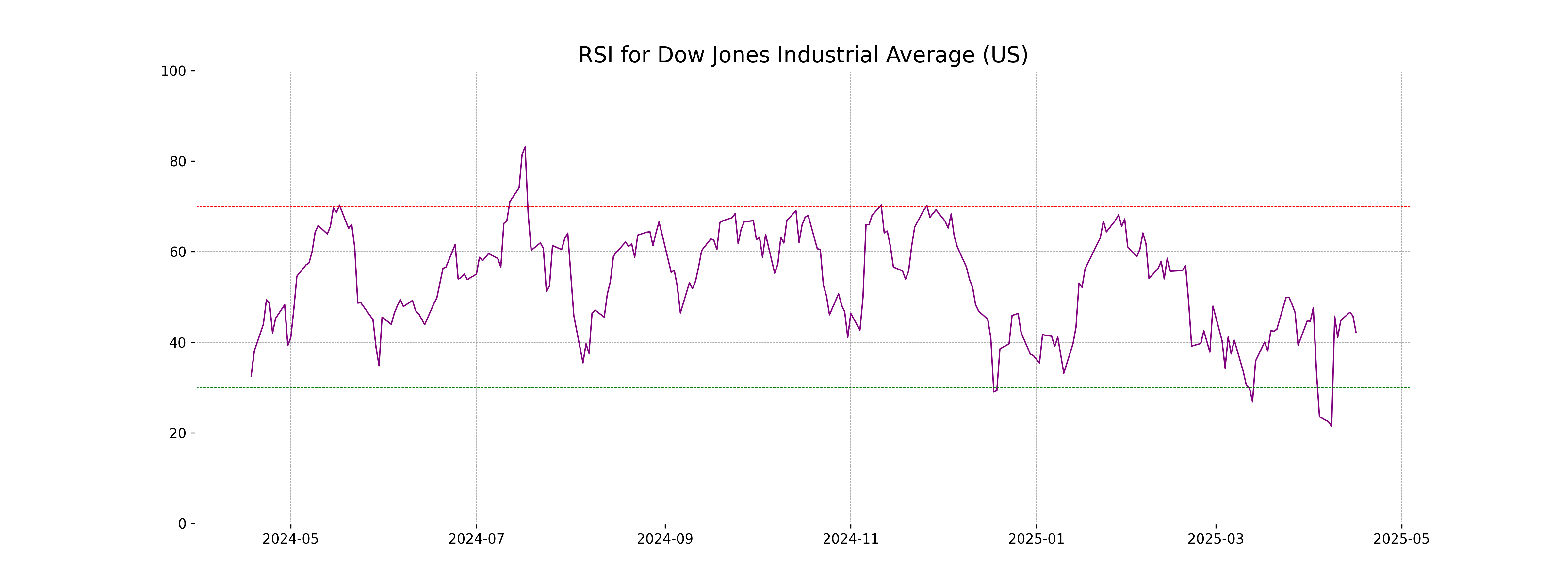 The RSI (Relative Strength Index) for the Dow Jones Industrial Average is 42.23, indicating a relatively neutral level as it is between 30 and 70. This suggests the index is neither in overbought nor oversold territory, but it is worth monitoring for potential changes if the RSI moves closer to the traditional thresholds of 30 or 70.