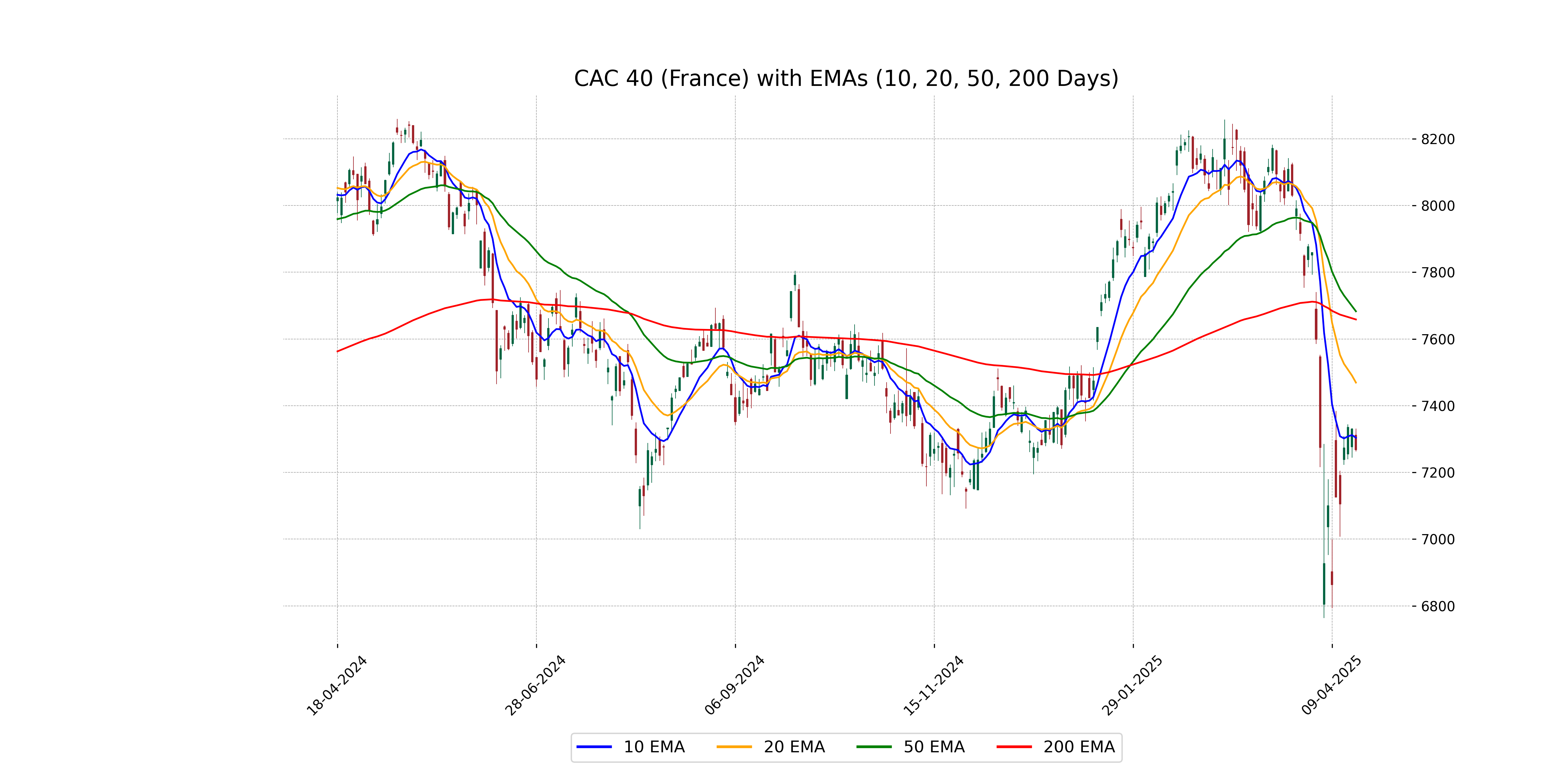 CAC 40 (France) closed below several key moving averages, including the 50 EMA (7682.85), 200 EMA (7658.42), and 20 EMA (7469.22), indicating potential bearish momentum. The close was also below the 10 EMA (7303.84), which further corroborates the downward trend.