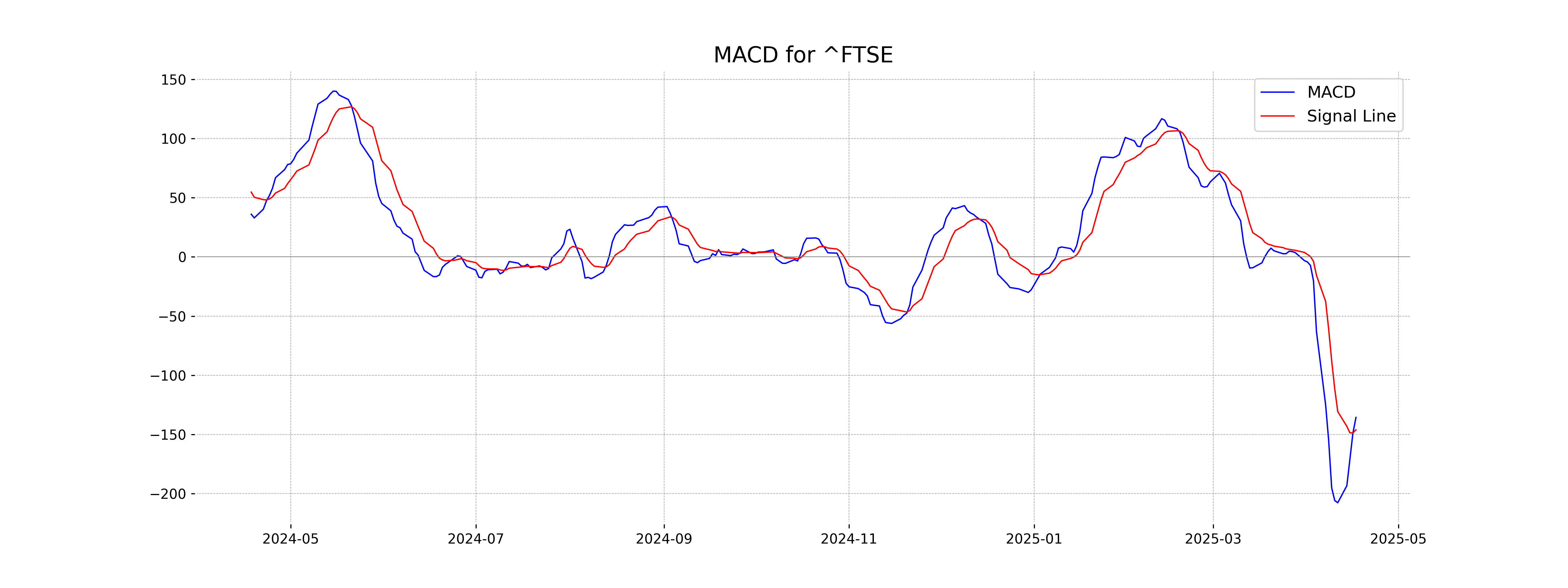 MACD Analysis for FTSE 100 (UK): The MACD value is -135.62, and the MACD Signal is -146.06, indicating a bearish trend. Since the MACD is above the Signal line, the downward momentum may be beginning to weaken slightly.