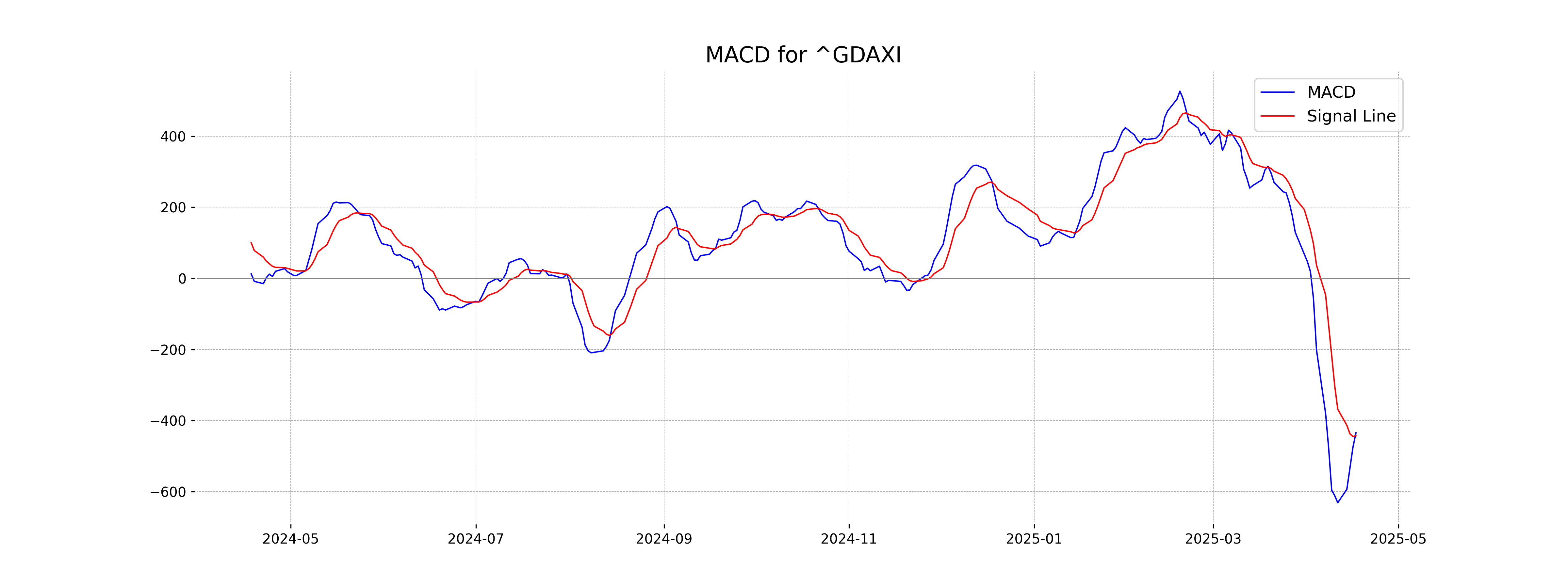 The DAX (Germany) is showing a bearish signal as the MACD (-434.94) is below the MACD Signal line (-443.07). This indicates a potential continuation of the downward trend.