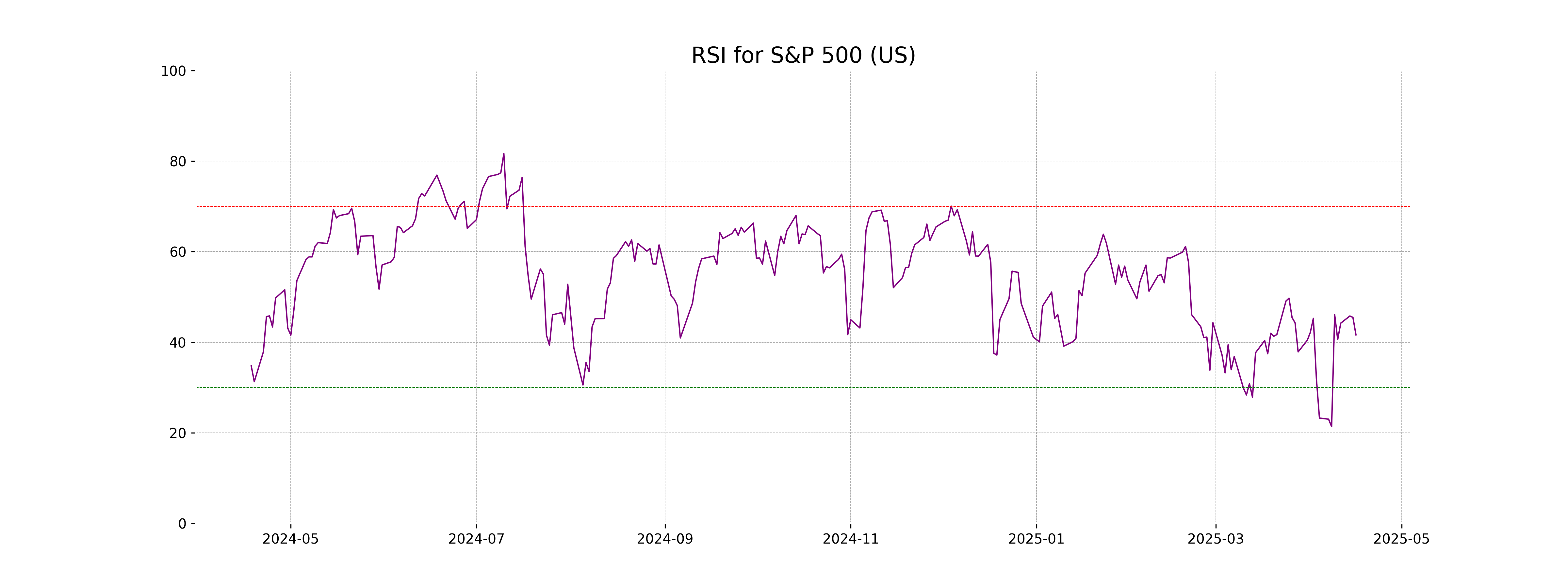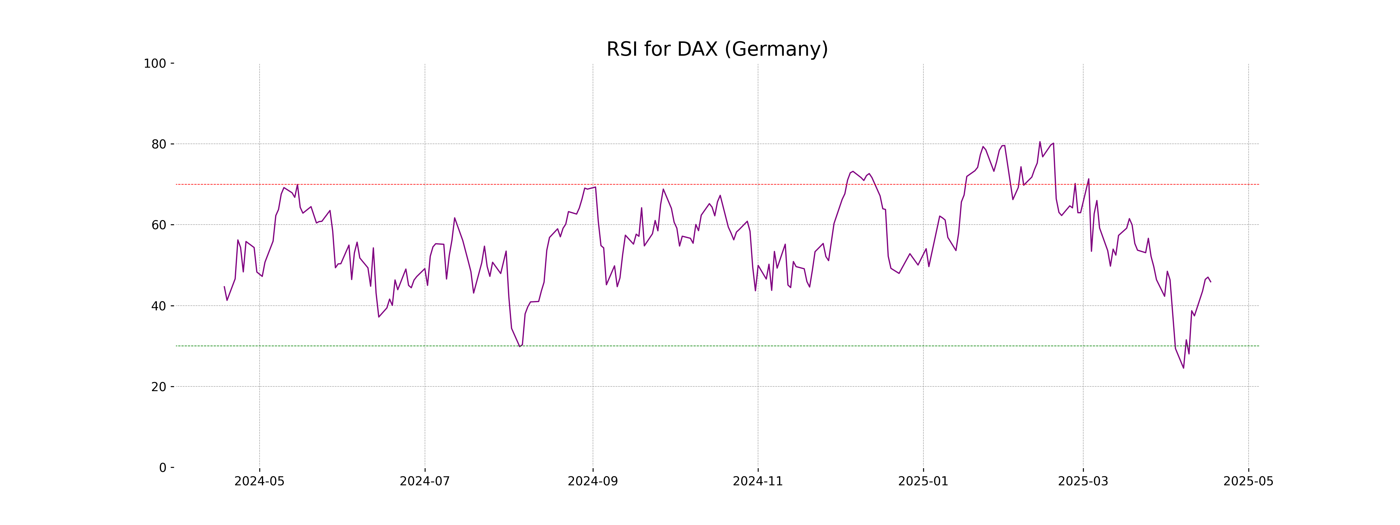 The current RSI for the DAX (Germany) is 45.89, indicating a neutral to slightly oversold status. RSI values typically range from 0 to 100, with values below 30 considered oversold and above 70 considered overbought. The index is not in an extreme RSI zone, suggesting there may not be a strong trend direction currently.