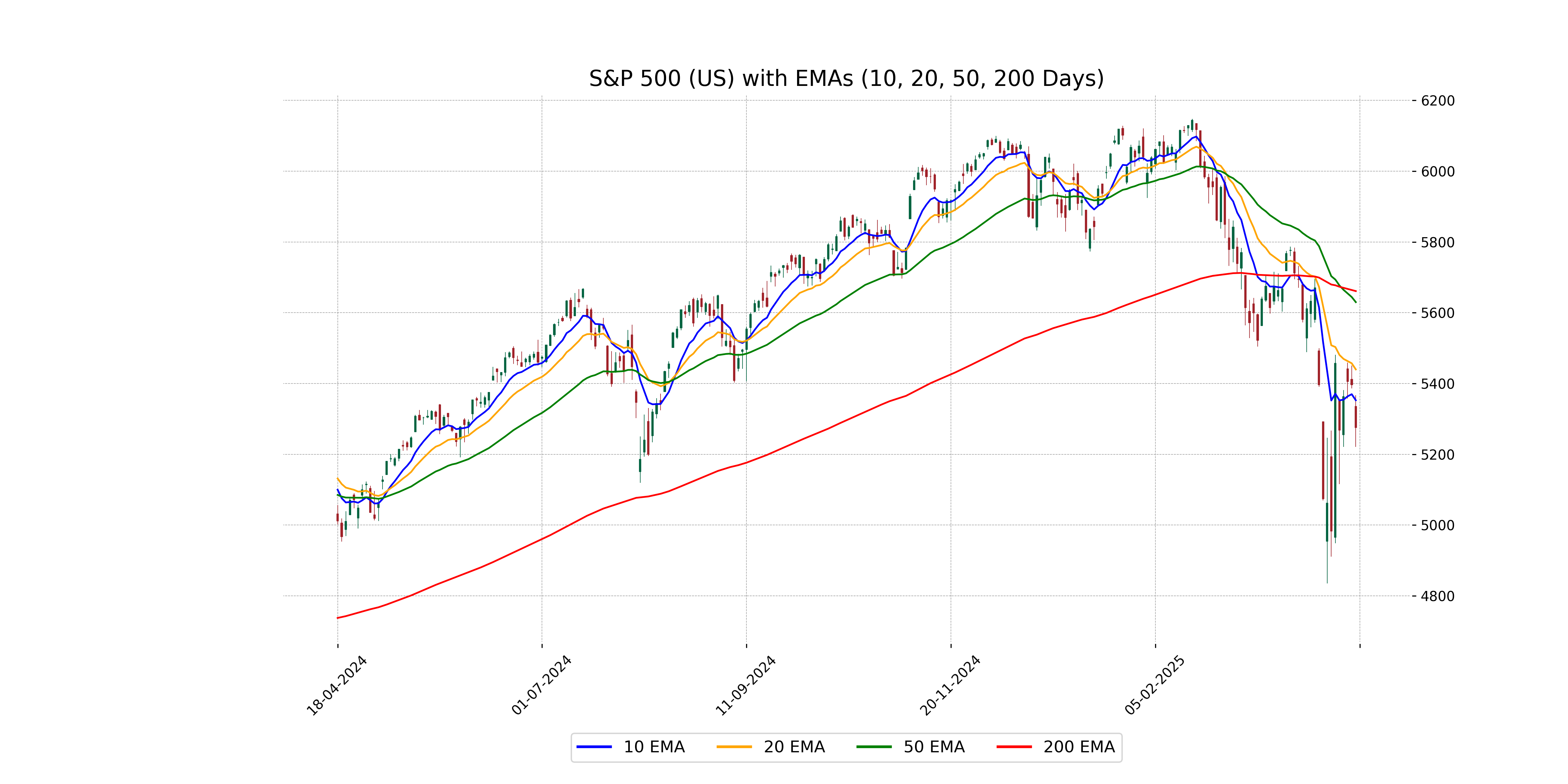 The S&P 500 is trading below its key moving averages, with the current closing price of 5275.70 below the 10 EMA of 5352.66, 50 EMA of 5629.99, and 200 EMA of 5661.19. This suggests a bearish trend in the market based on these technical indicators.