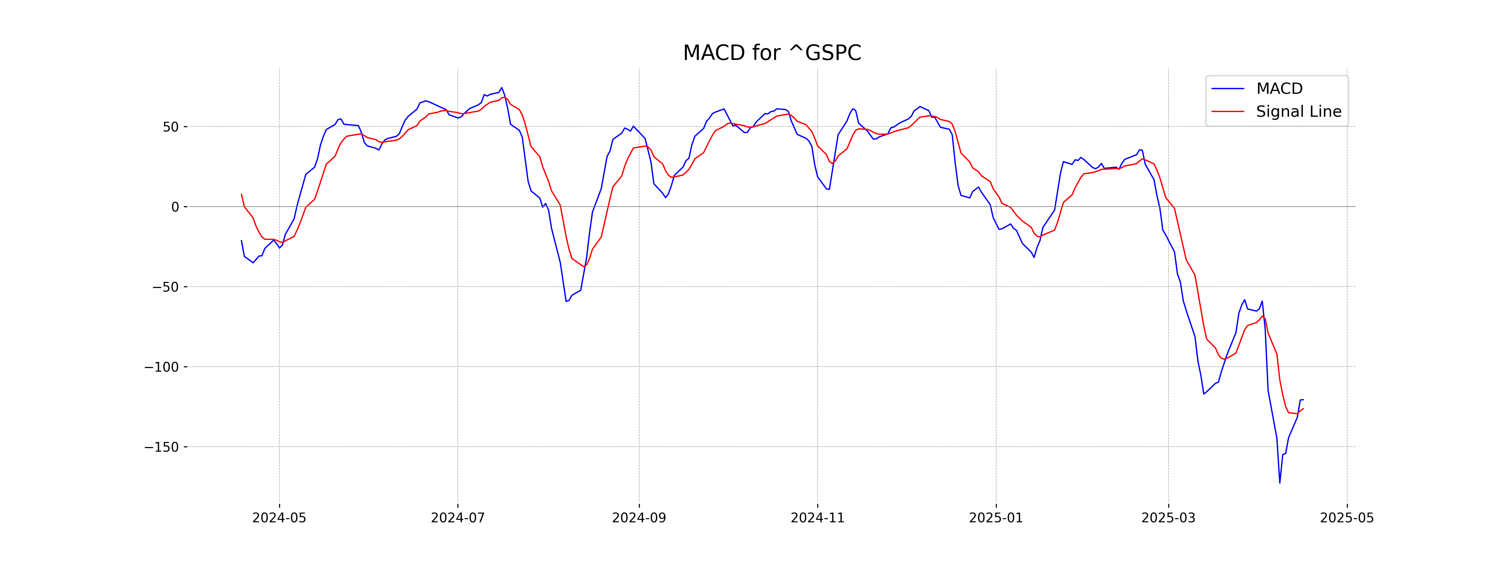The MACD value of -120.70, along with a MACD Signal of -126.32, suggests a bearish momentum for the S&P 500, as the MACD line is above the signal line. Both values being negative further reinforce the bearish trend.
