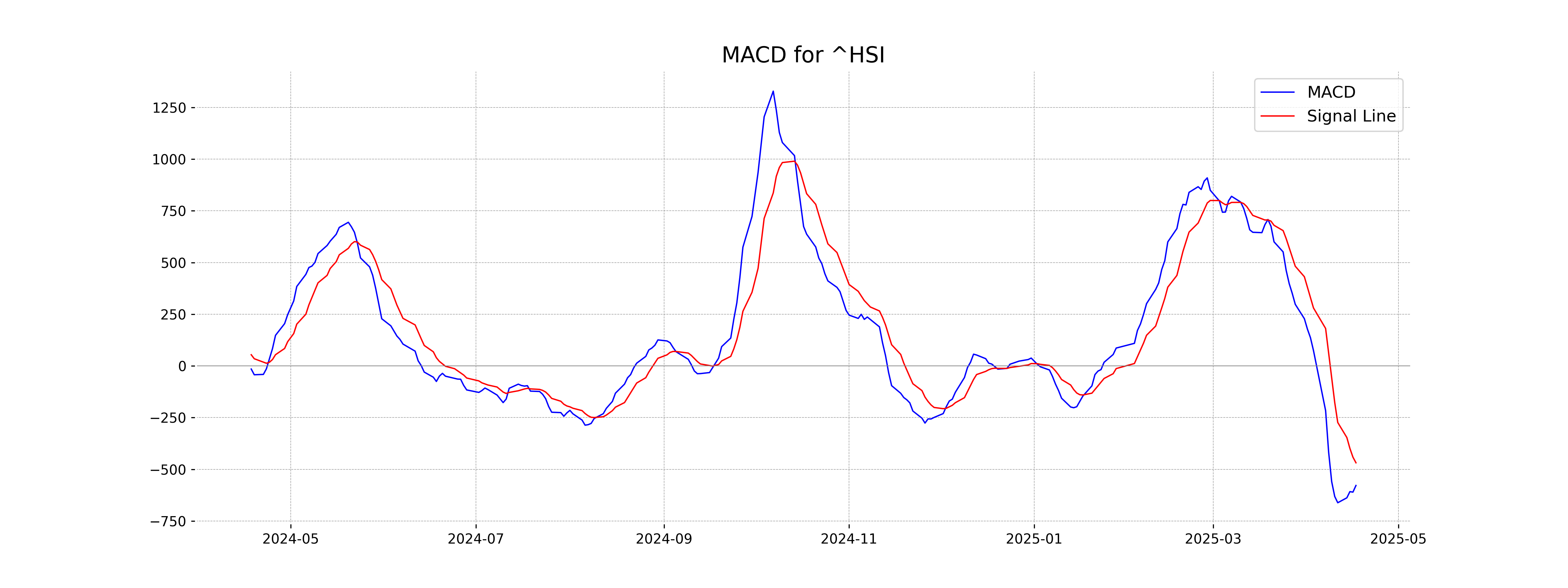 Based on the stock data for Hang Seng Index (Hong Kong), the MACD value of -578.41 is below the MACD Signal of -468.66, indicating a bearish trend. This suggests the momentum is currently negative, and the index may experience downward pressure in the short term.