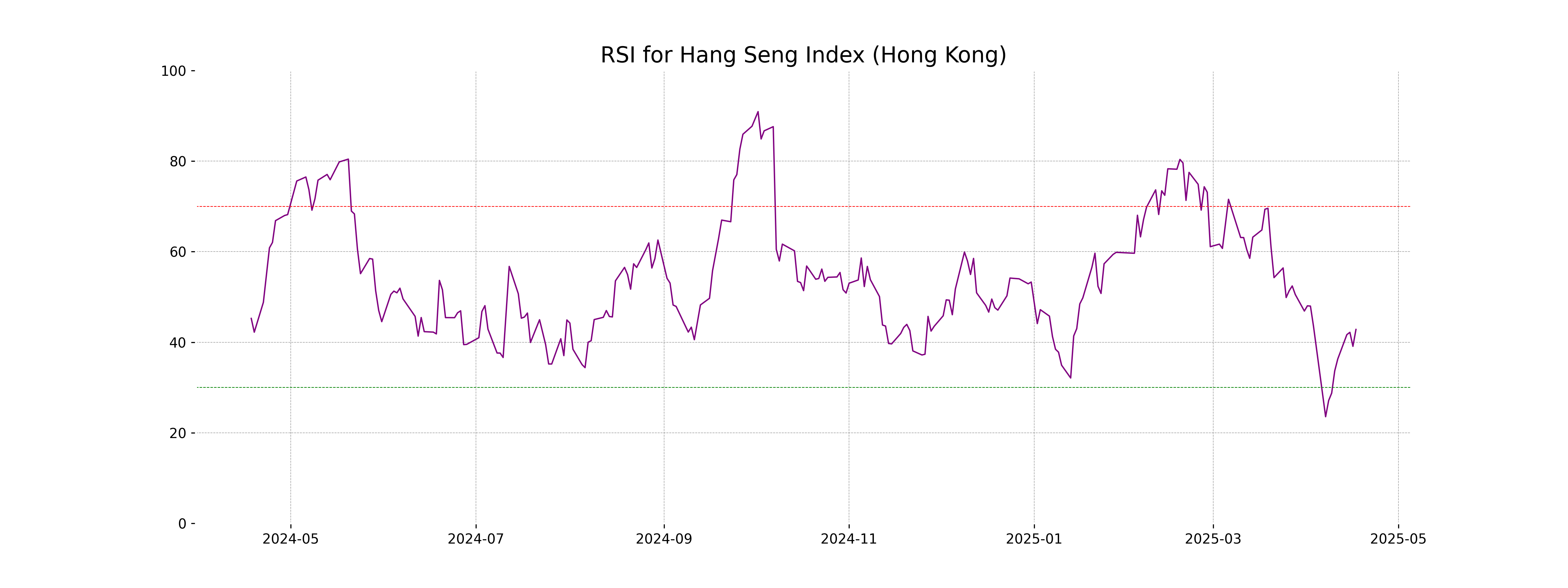 RSI Analysis for Hang Seng Index (Hong Kong): The RSI currently stands at 42.82, indicating that the index is neither overbought nor oversold, but relatively close to the oversold territory. This suggests that the index might have more room for downside movement before it enters an overbought state.