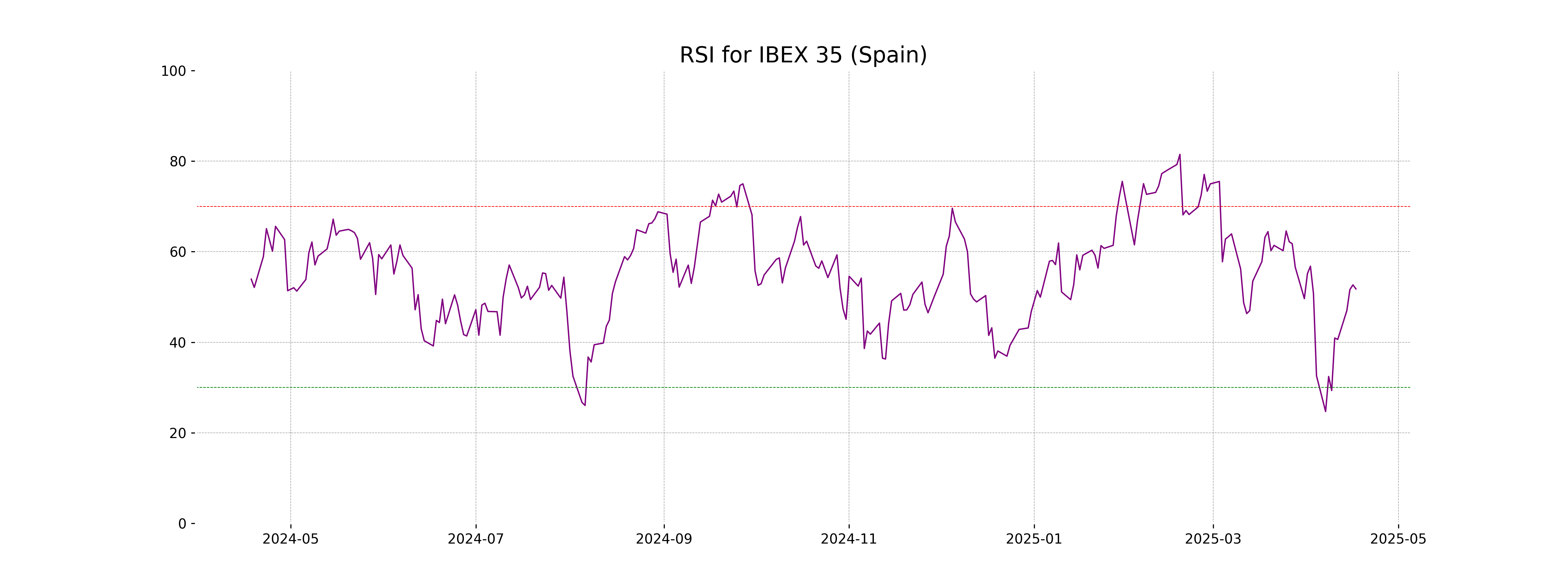 The RSI value for IBEX 35 (Spain) is 51.77, which suggests the index is in a neutral zone, neither overbought nor oversold. Generally, an RSI above 70 indicates an overbought condition, while below 30 suggests an oversold situation.