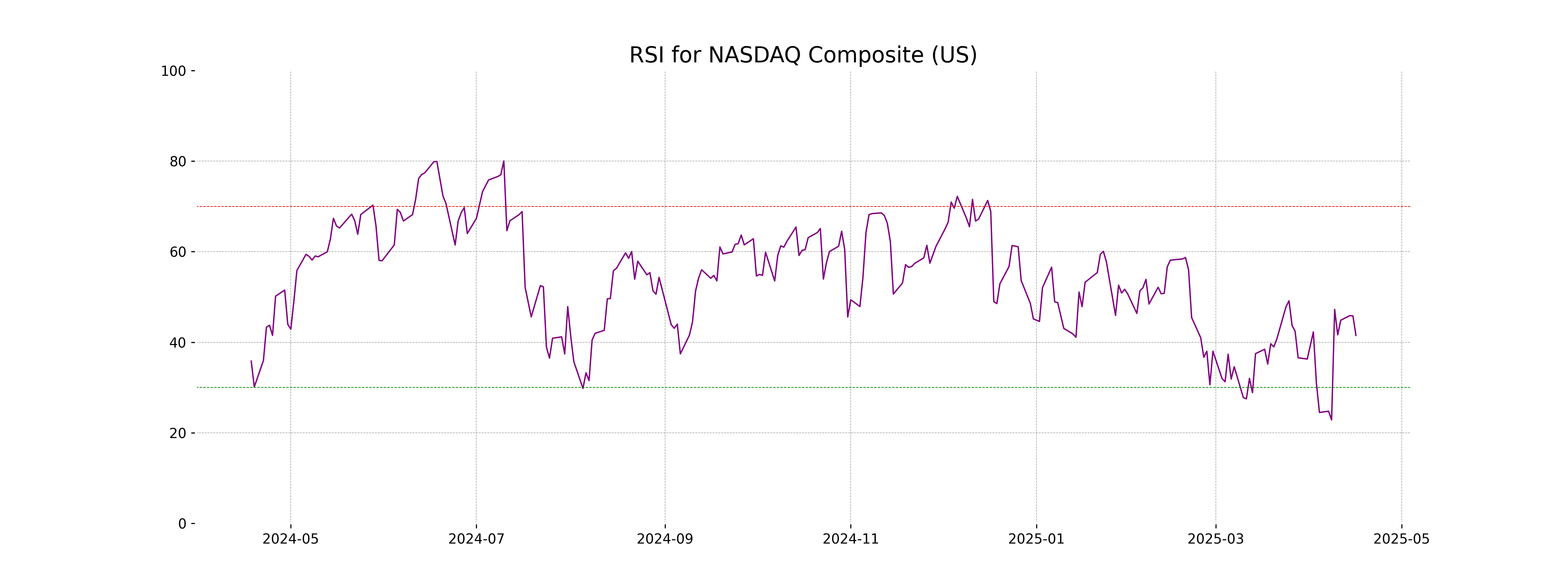 NASDAQ Composite RSI Analysis: The RSI (Relative Strength Index) for the NASDAQ Composite is 41.50, which indicates that the index is approaching the oversold territory. Typically, an RSI below 30 signals an asset is oversold, while above 70 suggests it is overbought. At 41.50, the NASDAQ Composite is relatively neutral but leaning towards being oversold.