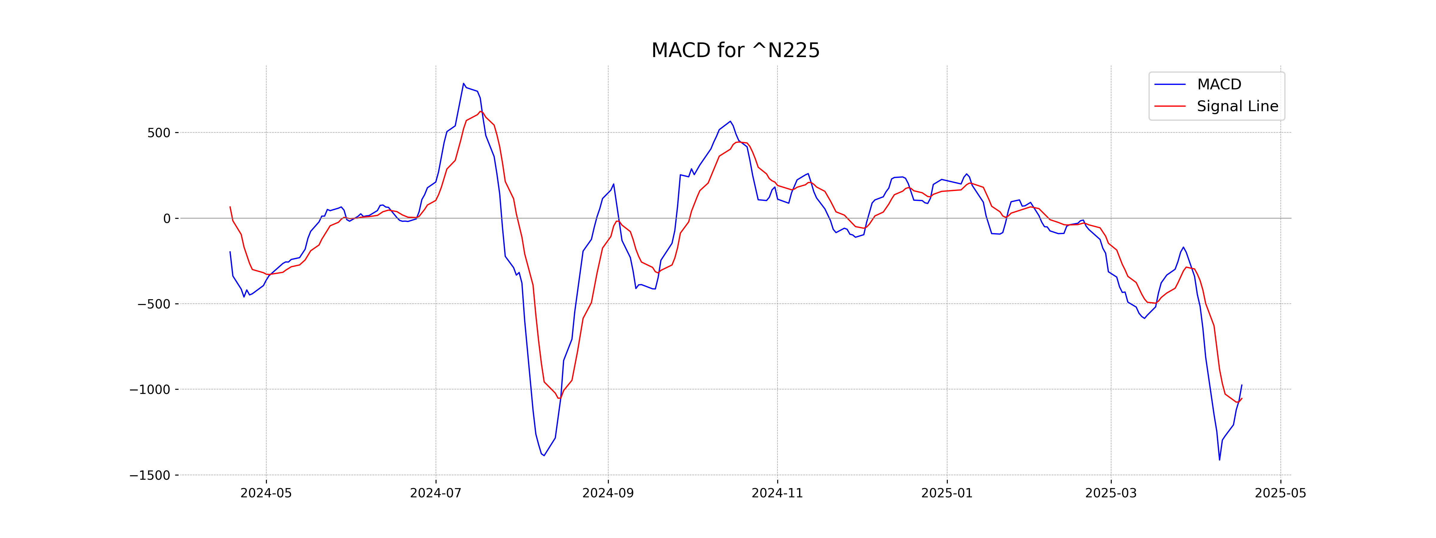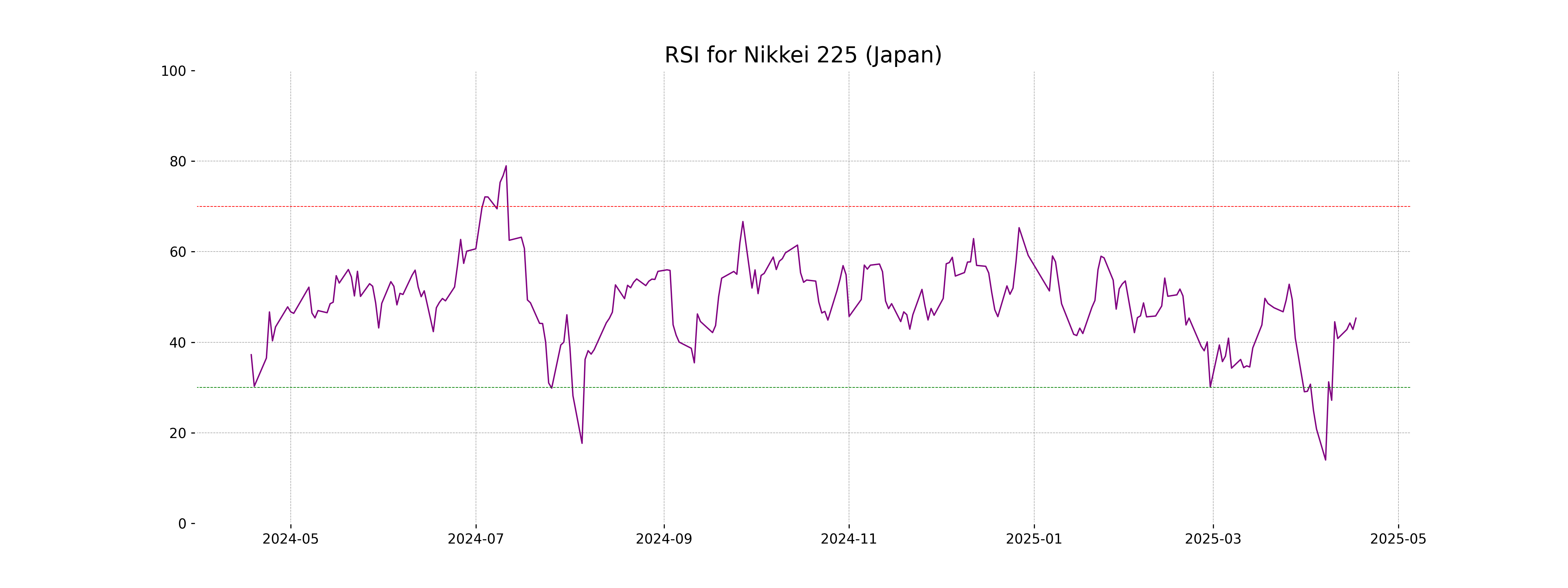 The RSI (Relative Strength Index) for Nikkei 225 is 45.32, indicating that the index is in the neutral range. Typically, an RSI below 30 suggests that an asset may be undervalued (potentially oversold), whereas an RSI above 70 may suggest overvaluation (potentially overbought). With the current RSI, the index does not show strong signs of being overbought or oversold.
