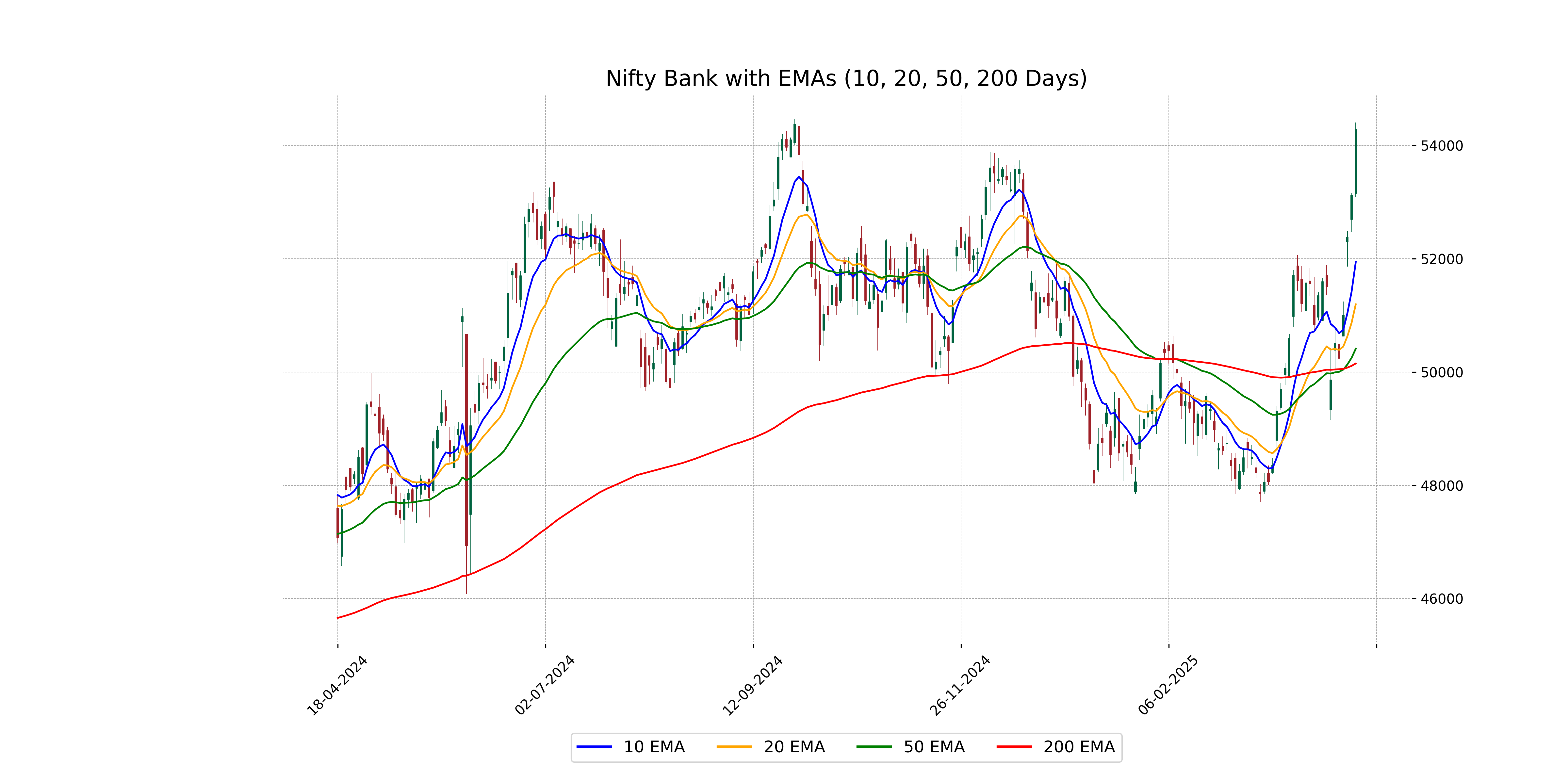 The Nifty Bank index closed at 54,290.20, which is above all its key moving averages, indicating a strong bullish trend. Specifically, it is trading above its 10-day EMA (51,941.23), 20-day EMA (51,195.99), 50-day EMA (50,410.27), and 200-day EMA (50,151.06), reflecting strong upward momentum.