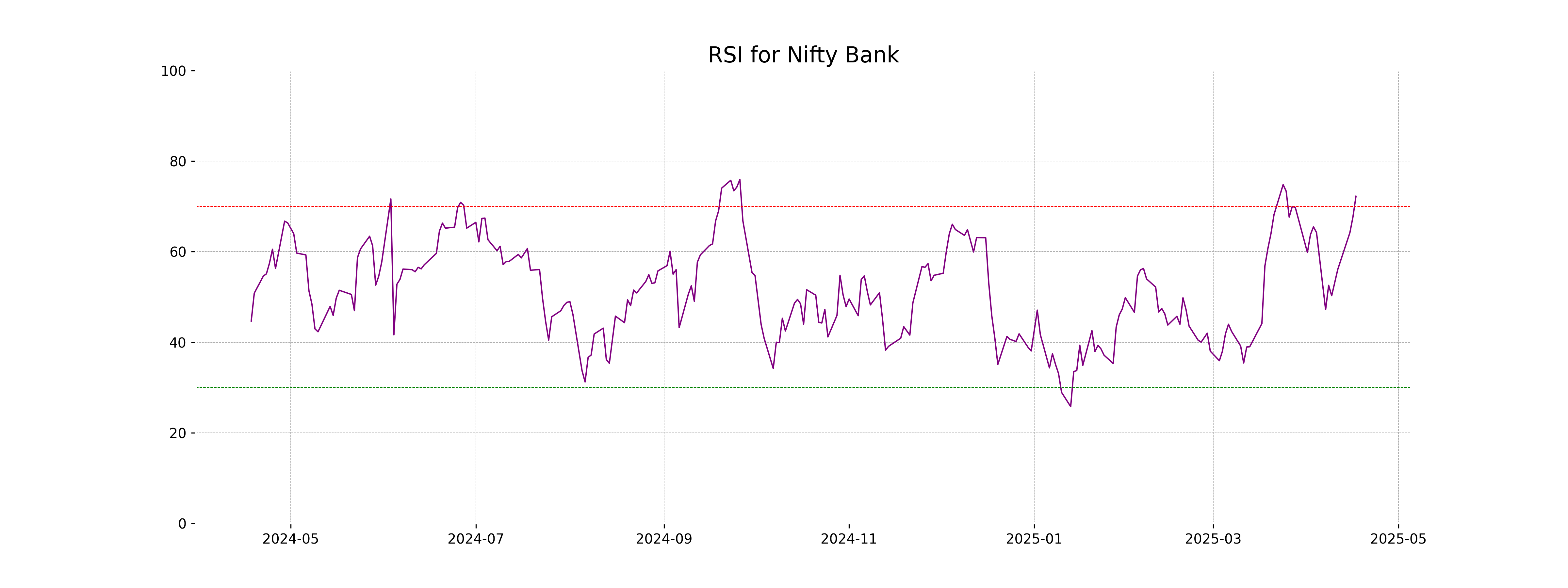 The RSI (Relative Strength Index) for Nifty Bank is currently at 72.24, which indicates that the stock is in the overbought territory. This suggests that the stock may be due for a price correction or consolidation if buying momentum decreases.