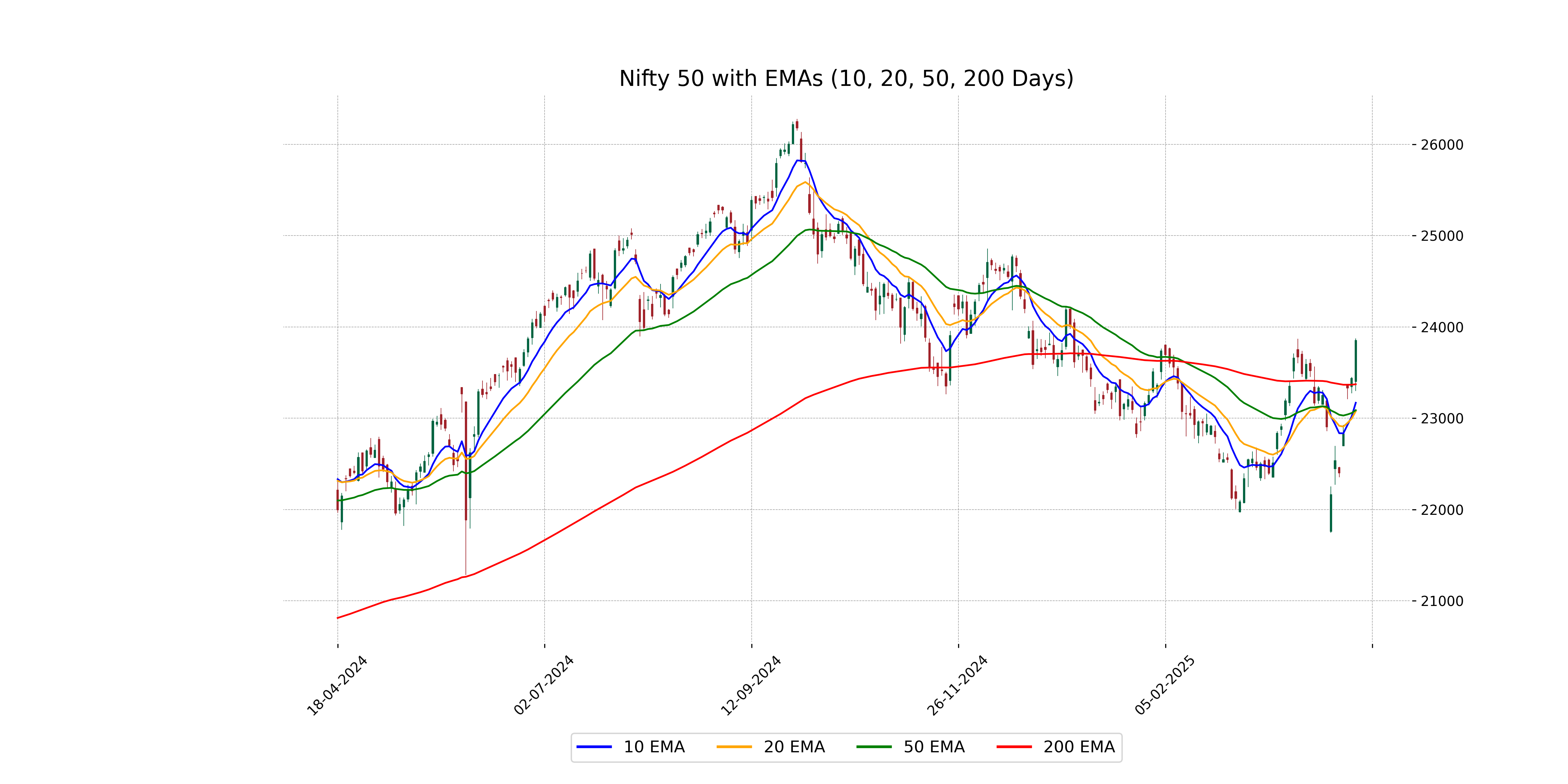 The closing price of Nifty 50 at 23851.65 is above all the key moving averages: the 50-day EMA at 23087.37, the 200-day EMA at 23371.40, the 10-day EMA at 23168.94, and the 20-day EMA at 23076.10, indicating a bullish trend. The RSI at 62.56 also supports positive momentum.