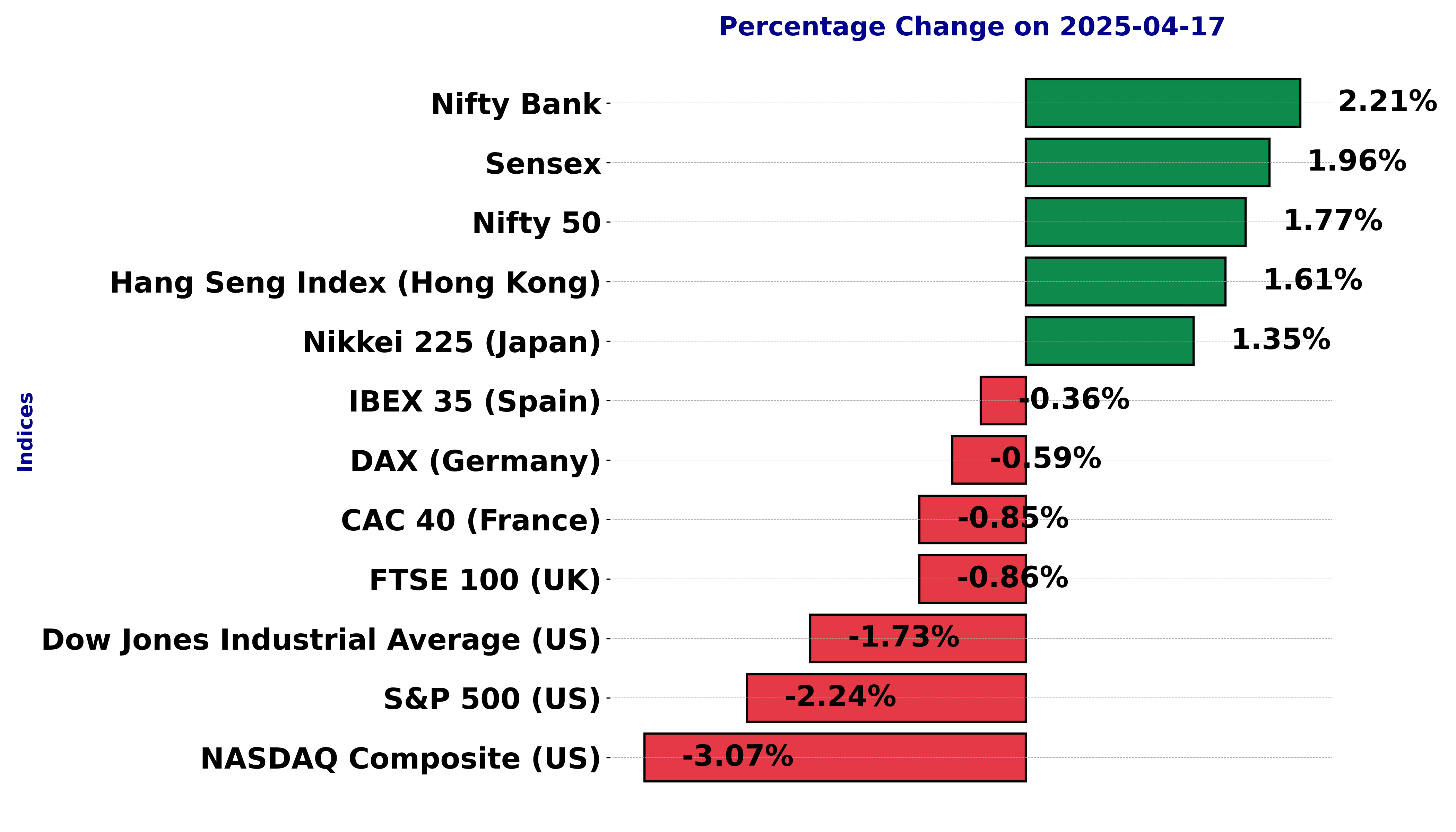 The international stock market indices showed varied performances on April 17, 2025, reflecting the economic sentiment across different regions.