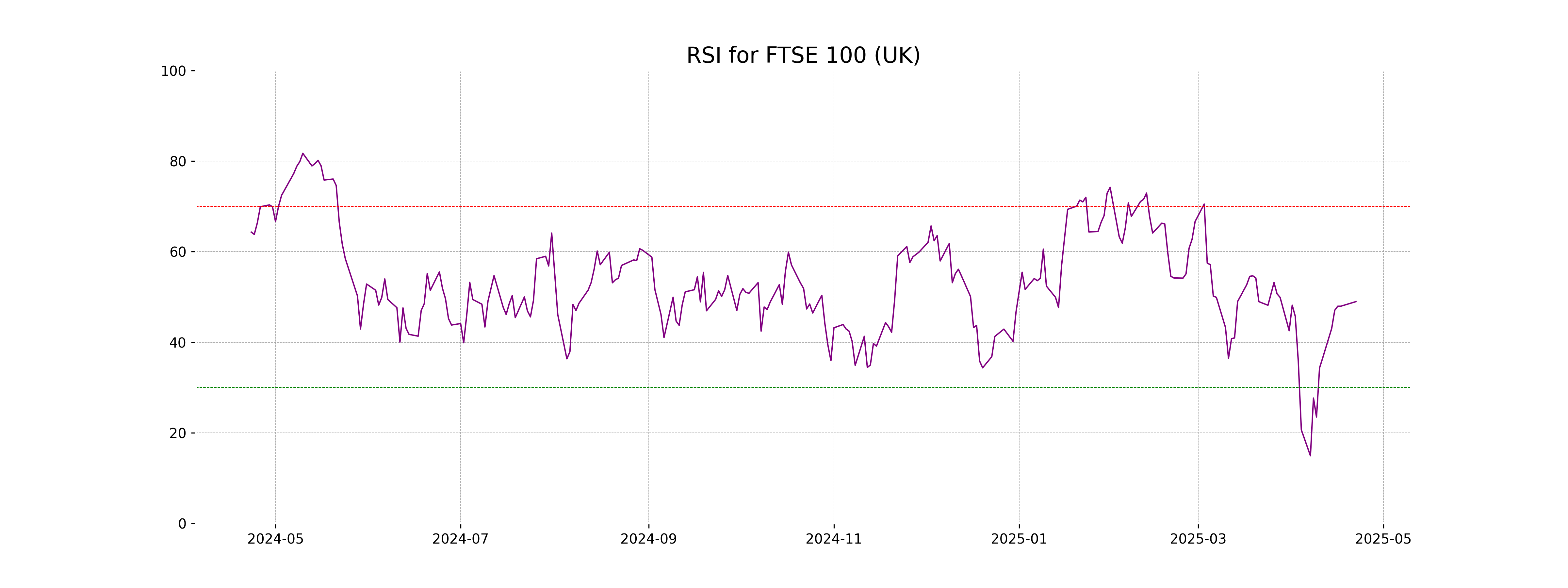 The RSI for FTSE 100 (UK) is 48.97, which suggests that the index is currently in a neutral trend, as an RSI close to 50 indicates a balance between buying and selling pressures. This level does not signal any immediate overbought or oversold conditions.
