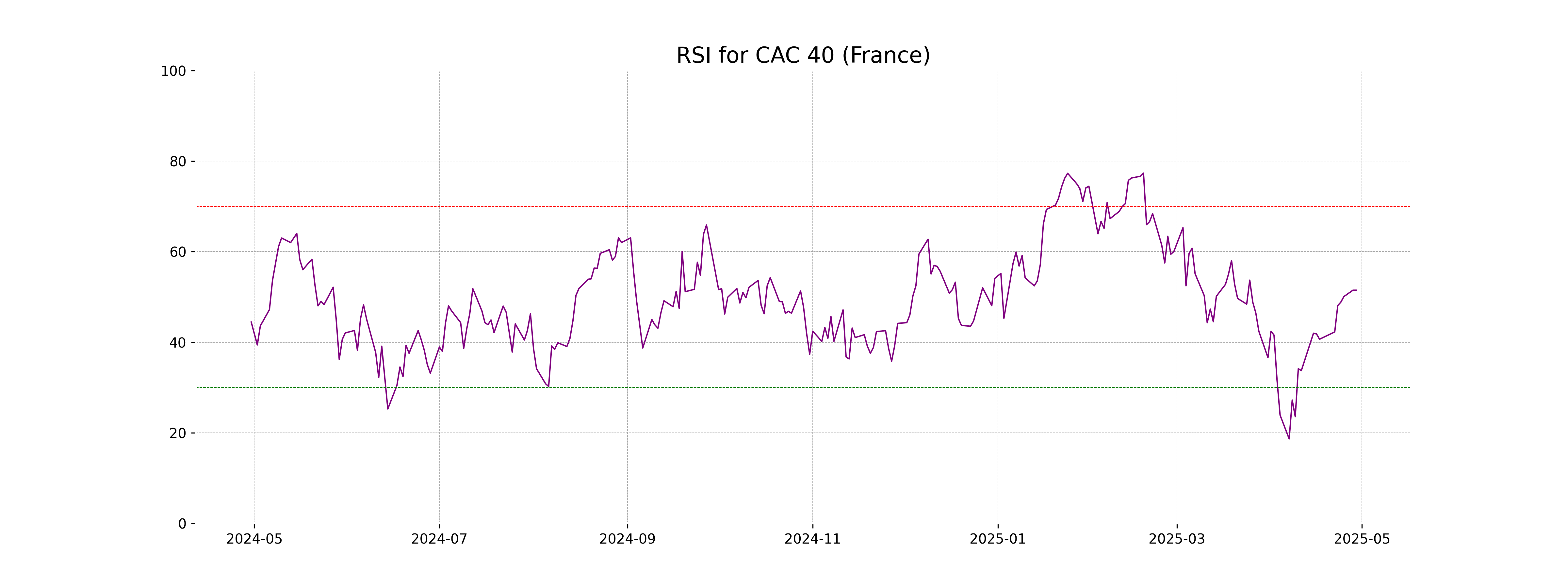 The CAC 40's RSI is 51.49, which indicates that the index is in a neutral zone. This suggests there is no strong momentum in either buying or selling, providing a balanced outlook for the short term.