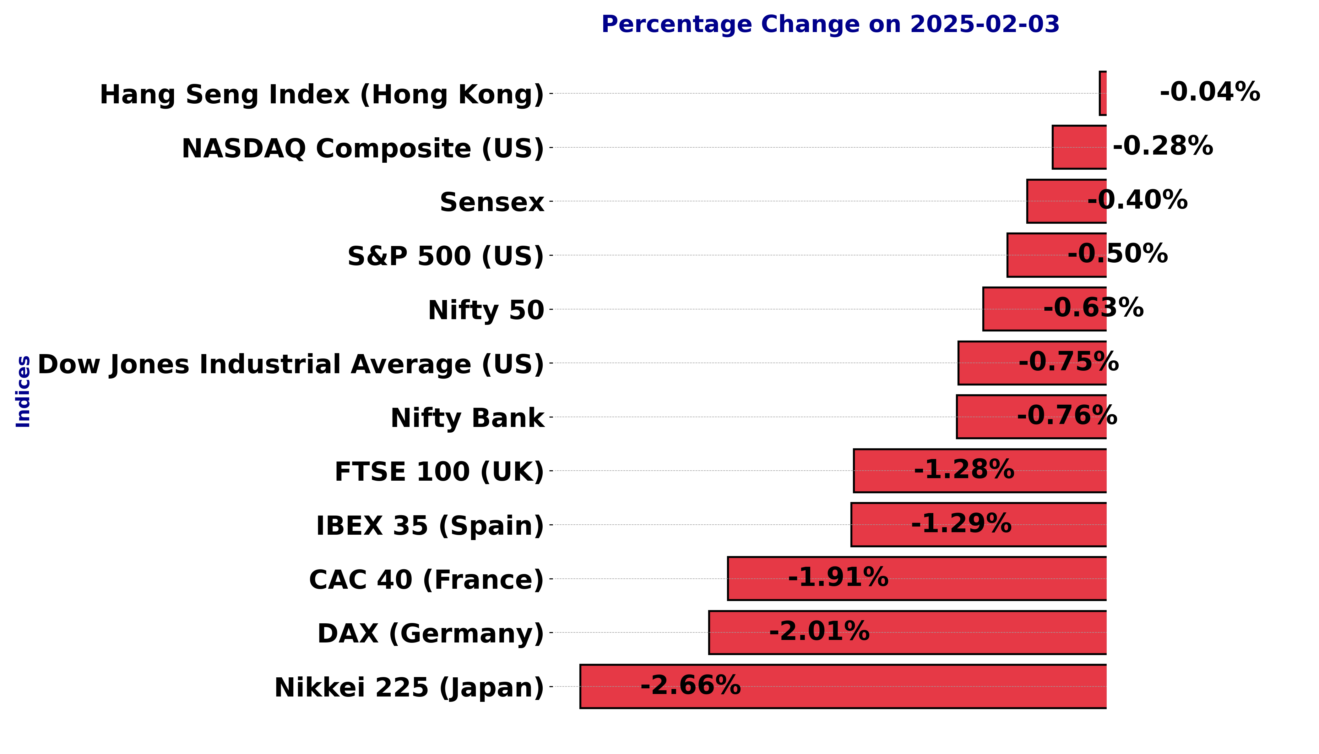 The international stock market indices showed varied performances on February 03, 2025, reflecting the economic sentiment across different regions.