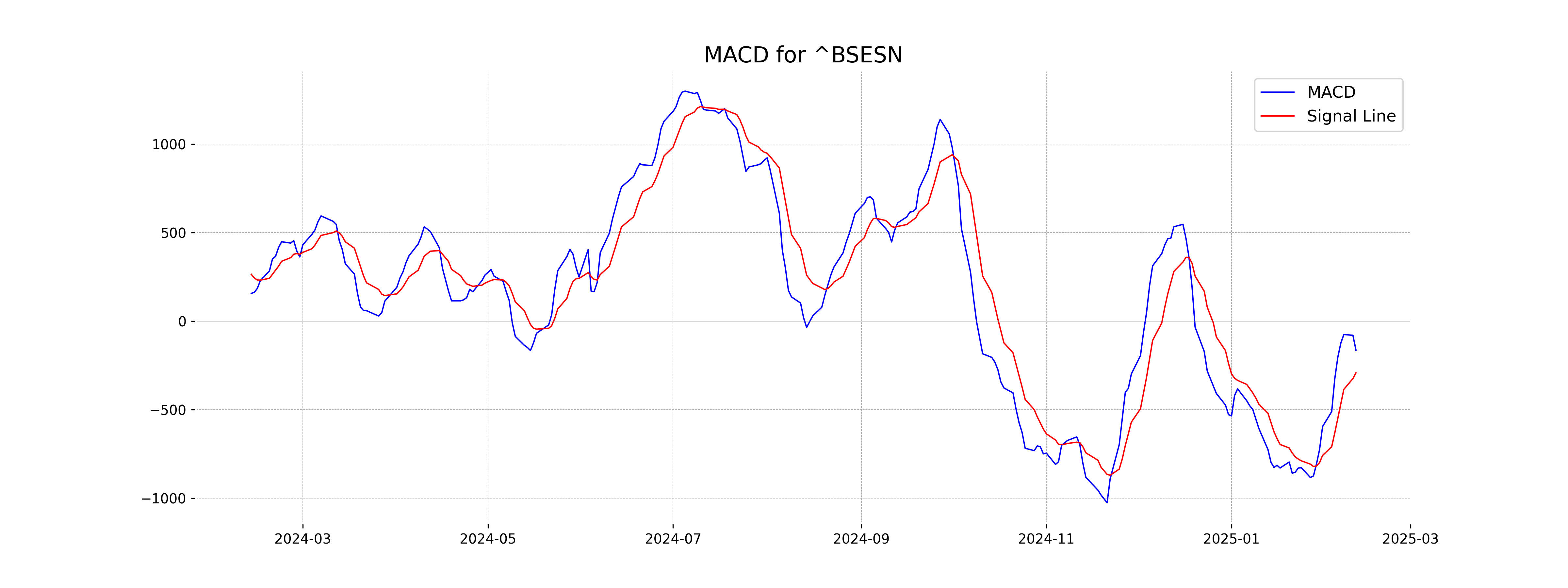 The BSESN opened at 77,384.98 and closed at 76,293.60, experiencing a significant drop with a percentage change of -1.32%, amounting to a loss of 1,018.20 points. The RSI stands at 41.92, indicating a bearish momentum, while the MACD of -163.98 suggests a downward trend, although it is above the MACD Signal line of -292.40.