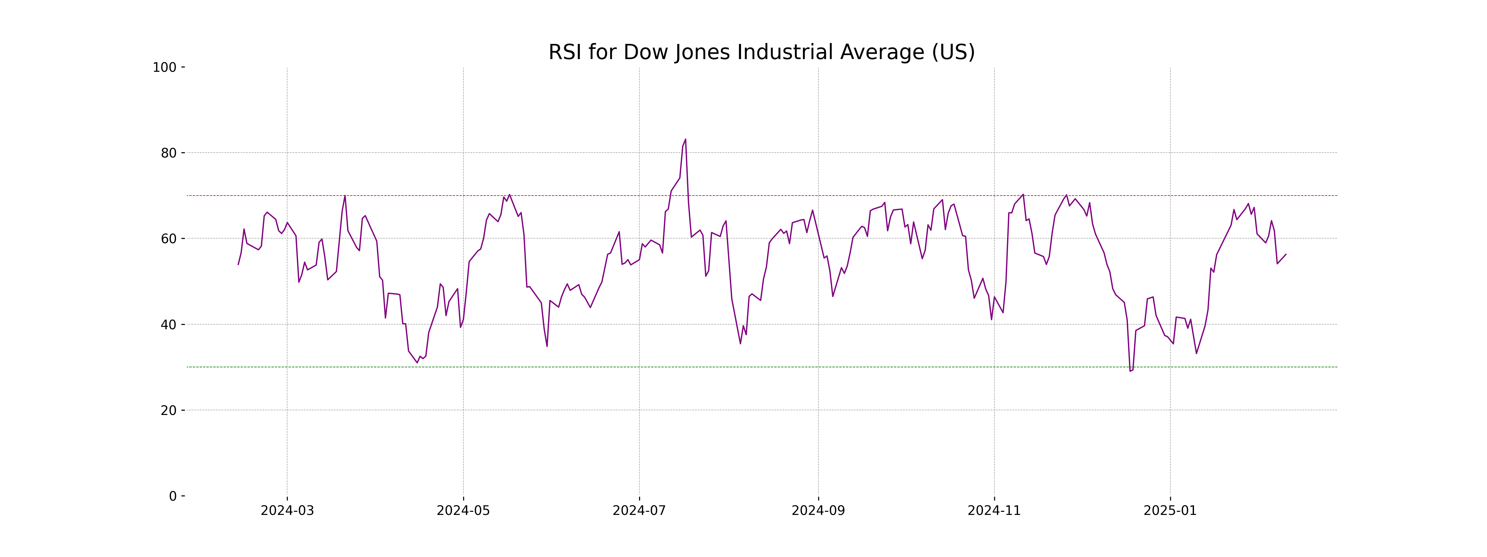 The RSI for the Dow Jones Industrial Average stands at 56.28, indicating a neutral position as it's between the typical overbought (>70) and oversold (<30) thresholds. This suggests a balanced momentum with no immediate signals of strong buying or selling pressures.